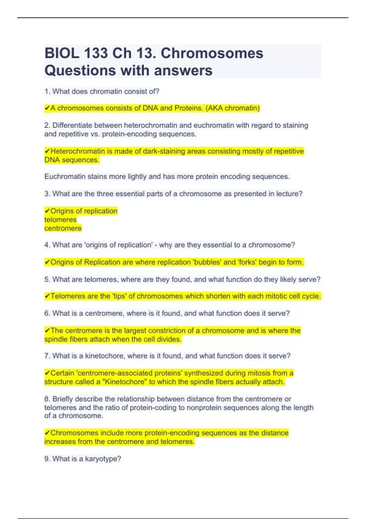 BIOL 133 Ch 13. Chromosomes Questions with answers