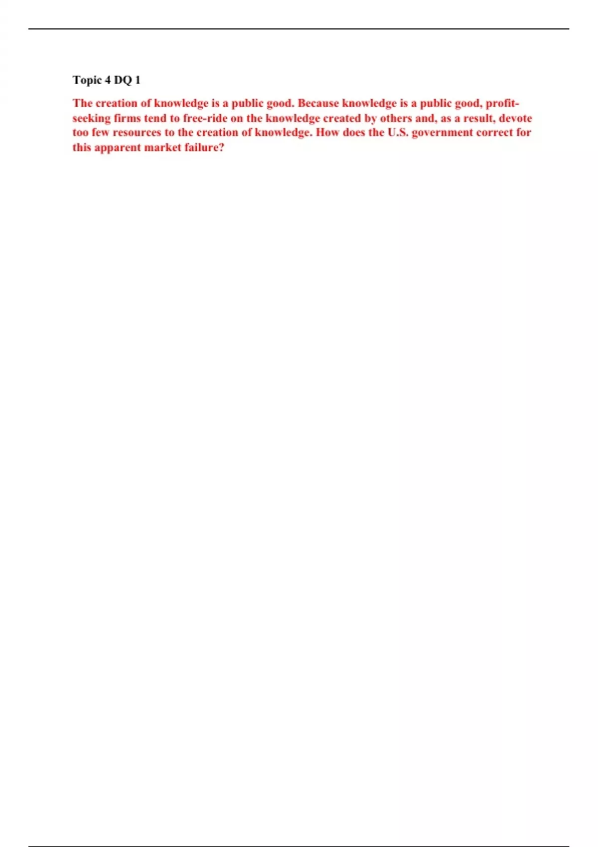 Topic 4DQ1 The creation of knowledge is a public good. Because knowledge is a public good, profit-seeking firms tend to free-ride on the knowledge created by others and, as a result, devote too few resources to the creation of knowledge. How does the U.S. government correct for this apparent market failure?