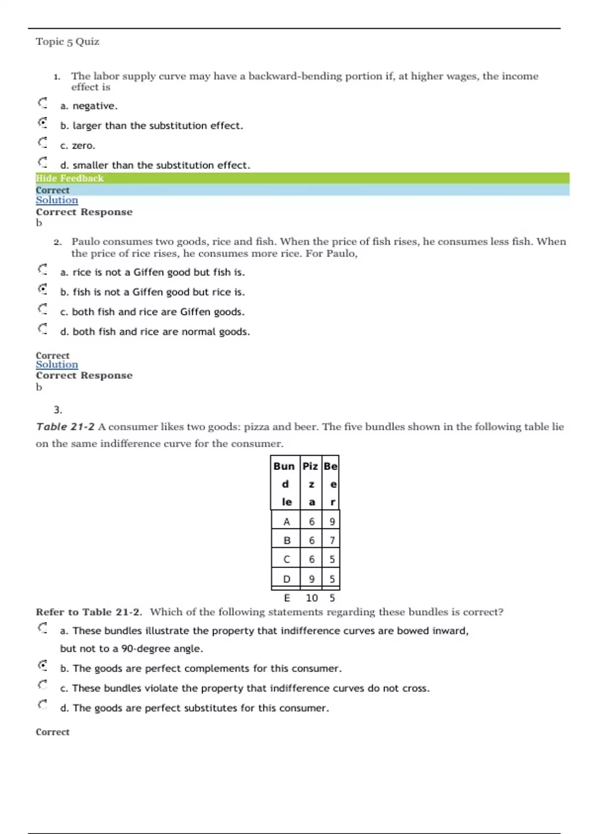 1. Question: Thelaborsupplycurvemayhaveabackward-bendingportionif,athigherwages,theincomeeffectis thepriceofricerises,heconsumesmorerice.ForPaulo, 2. Question: Table21-2Aconsumerlikestwogoods:pizzaandbeer.Thefivebundles shownin thefollowingtablelieonthesameindifferencecurvefortheconsumer. 3. Question: RefertoTable21-2. Whichofthefollowingstatementsregardingthesebundlesiscorrect? 4. Question: When a consumer is purchasing the best combination of two goods, X and Y, subject to a budgetconstraint, we say that the consumer is at an optimal choice point. A graph of an optimal choicepointshowsthatitoccurs 5. Question: Whenthepriceofanormalgoodincreases, 6. Question: Table 22-1 …. Three friends—Linda, Stephanie, and Jamie—are deciding where to go together for vacation. They all agree that they should go to one of the three places: France, Greece, or Italy. They also agree that they will have two pairwise votes to determine where to go on vacation, with the majority determining the outcome on each vote. The first, second, and third choices for each person are as indicated in the following table.Refer to Table 22-1. If the first vote pits France against Greece and the second vote pits Italy against the winner of the first vote, then the outcome is as follows:Figure 21-3…..In each case, the budget constraint moves from BC1 to BC2. 7. Question: RefertoFigure21-3.WhichofthegraphsinthefigurecouldreflectasimultaneousincreaseinthepriceofgoodXanddecreaseinthepriceofgoodY? 8. Question: Scenario21-1 …. Supposethepriceofhotwingsis$10,thepriceofbeeris$1,andtheconsumer'sincomeis$50.Inaddition,supposetheconsumer'sbudgetconstraintillustrateshotwingsonthehorizontalaxisandbeerontheverticalaxis.RefertoScenario21-1.Ifthepriceofbeerdoublesto$2,thenthe 9. Question: Whenonepartyisbetterinformedaboutaneconomicsituationthananotherparty,economistsdescribetheproblemas 10. Question: Thetemptation of imperfectlymonitoredworkerstoshirk their responsibilitiesisanexample of