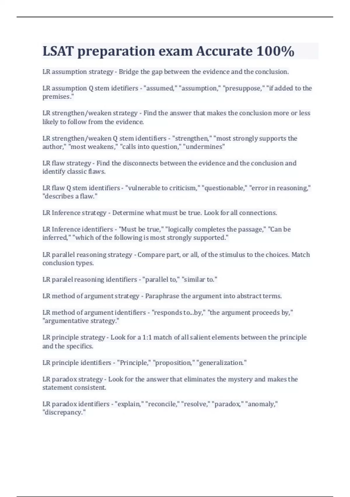 LSAT preparation exam Accurate 100% LR assumption strategy - Bridge the gap between the evidence and the conclusion. LR assumption Q stem idetifiers - "assumed," "assumption," "presuppose," "if added to the premises." LR strengthen/weaken strategy - Find the answer that makes the conclusion more or less likely to follow from the evidence. LR strengthen/weaken Q stem identifiers - "strengthen," "most strongly supports the author," "most weakens," "calls into question," "undermines" LR flaw strategy - Find the disconnects between the evidence and the conclusion and identify classic flaws. LR flaw Q stem identifiers - "vulnerable to criticism," "questionable," "error in reasoning," "describes a flaw." LR Inference strategy - Determine what must be true. Look for all connections. LR Inference identifiers - "Must be true," "logically completes the passage," "Can be inferred," "which of the following is most strongly supported." LR parallel reasoning strategy - Compare part, or all, of the stimulus to the choices. Match conclusion types. LR paralel reasoning identifiers - "parallel to," "similar to." LR method of argument strategy - Paraphrase the argument into abstract terms. LR method of argument identifiers - "responds to...by," "the argument proceeds by," "argumentative strategy." LR principle strategy - Look for a 1:1 match of all salient elements between the principle and the specifics. LR principle identifiers - "Principle," "proposition," "generalization." LR paradox strategy - Look for the answer that eliminates the mystery and makes the statement consistent. LR paradox identifiers - "explain," "reconcile," "resolve," "paradox," "anomaly," "discrepancy." LR point at issue strategy - Find the issue on which both speakers have an opinion and disagree. LR point at issue identifiers - "A and B disagree over," "Point at issue." LR main point strategy - Locate the authors conclusion. Be wary of misleading conclusion keywords." LR main point identifiers - "main point," "main conclusion." LR role of statement strategy - Locate the statement and characterize its function in the stimulus LR role of statement identifiers - "Plays which one of the following roles," "figures in the argument in which one of the following ways." Logical Reasoning strategy - 1. Identify the question type 2. Untangle the stimulus 3. make a prediction 4. Evaluate the answer choices. Reading Comprehension Strategy - 1. Read the passage strategically 2. Identify the question type 3. Research the relevant text 4. Make a prediction 5. Evaluate the answer choices RC global strategy - Think big picture. Review T/S/MI/P. Consult roadmap. RC global identifiers - "Main idea," "purpose," "organization." RD detail strategy - Research the relevant text. The answer is explicitly stated in the passage. RC detail identifiers - "According to the author," "according to the passage," "the passage states," "the author mentions." Categorical Language. RC inference strategy - Read between the lines. Perhaps combine statements. Identify what must follow from the passage. RC inference identifiers - "The author implies," "the passage suggests," "likely to agree," "based on." Loose language. RC logic function strategy - Look at the context of the detail or paragraph and ask why the author put it there.