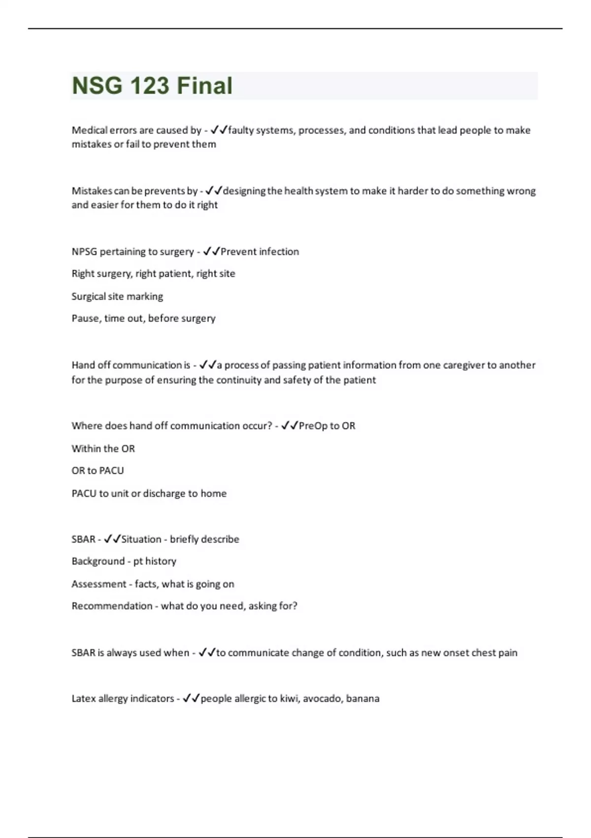 Medical errors are caused by - faulty systems, processes, and conditions that lead people to make mistakes or fail to prevent them Mistakes can be prevents by - designing the health system to make it harder to do something wrong and easier for them to do it right NPSG pertaining to surgery - Prevent infection Right surgery, right patient, right site Surgical site marking Pause, time out, before surgery Hand off communication is - a process of passing patient information from one caregiver to another for the purpose of ensuring the continuity and safety of the patient Where does hand off communication occur? - PreOp to OR Within the OR OR to PACU PACU to unit or discharge to home SBAR - Situation - briefly describe Background - pt history Assessment - facts, what is going on Recommendation - what do you need, asking for? SBAR is always used when - to communicate change of condition, such as new onset chest pain Latex allergy indicators - people allergic to kiwi, avocado, bananaClassifications of surgical urgency - Elective - pt choice Urgent - needs soon Emergent - will die Surgical degrees of risk - minor or major Surgical purposes - Diagnostic Curative - to cure Restorative - to restore, as in function, hip/knee Palliative - to provide comfort/pain relief in disease process Cosmetic - restore/improve personal appearance Intestinal perf urgency? - Emergent Cholecystectomy urgency? - Urgent