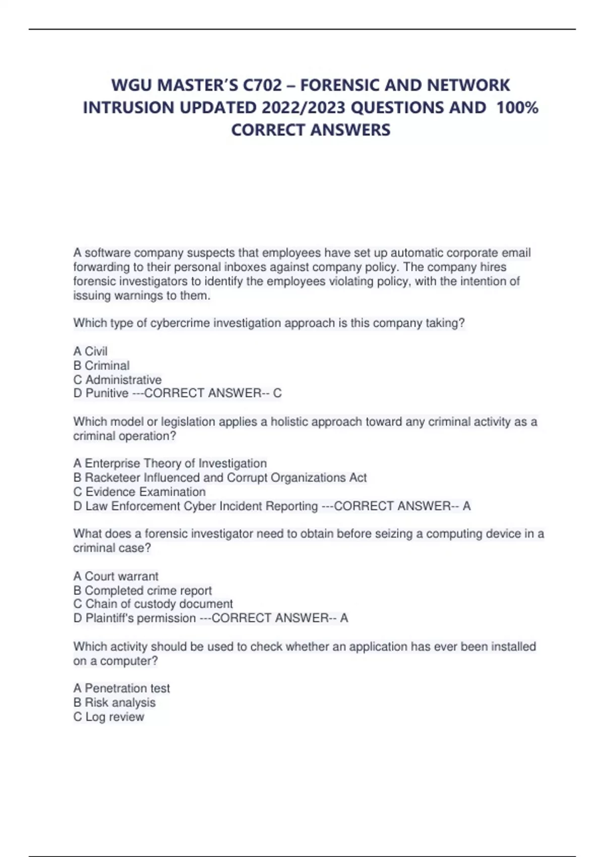 WGU MASTER’S C702 – FORENSIC AND NETWORK INTRUSION UPDATED 2022/2023 QUESTIONS AND 100% WGU MASTER’S C702 – FORENSIC AND NETWORK INTRUSION UPDATED 2022/2023 QUESTIONS AND 100% CORRECT ANSWERS