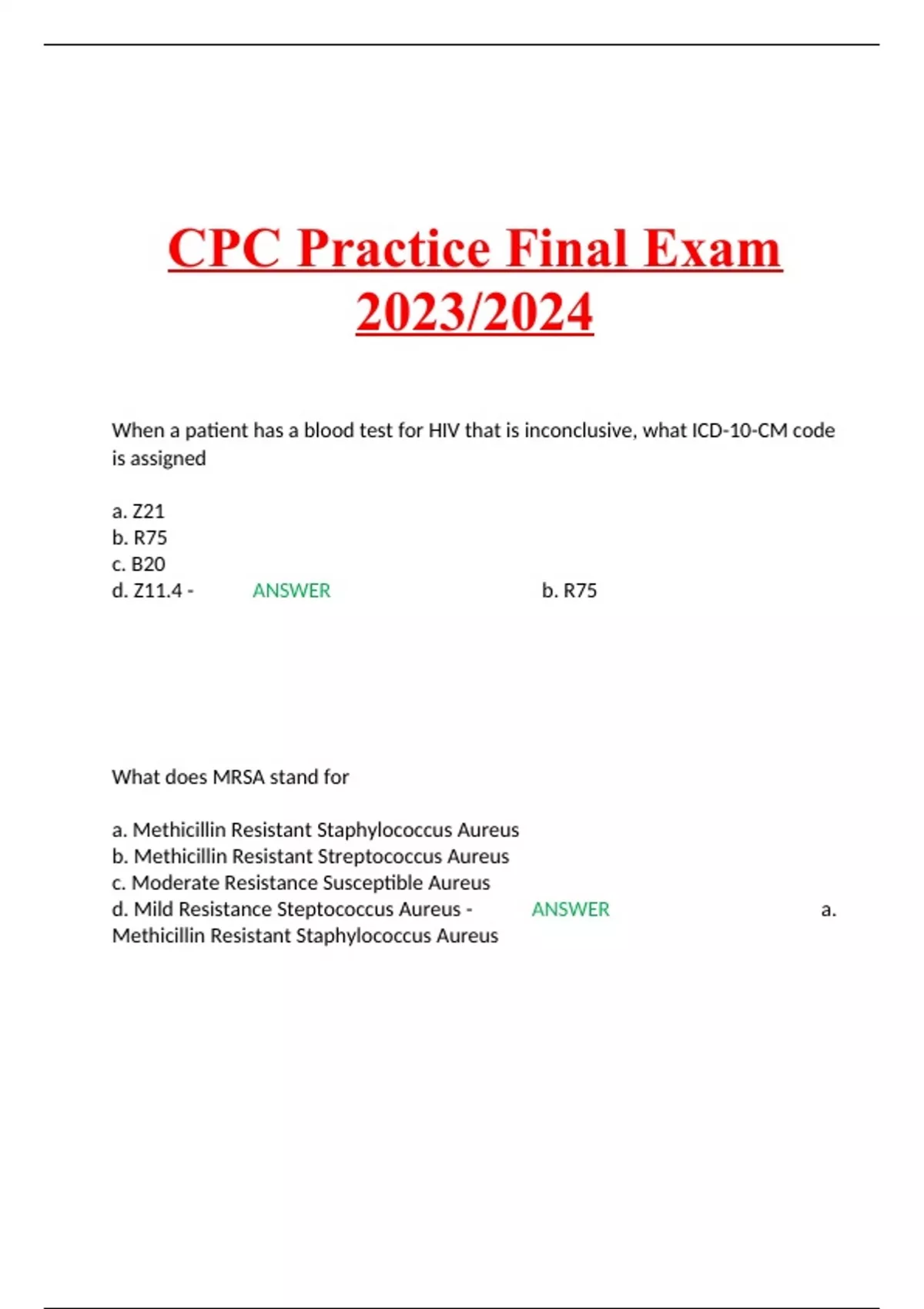 CPC Practice Final Exam 2023/2024 When a patient has a blood test for HIV that is inconclusive, what ICD-10-CM code is assigned a. Z21 b. R75 c. B20 d. Z11.4 - ANSWER b. R75 What does MRSA stand for a. Methicillin Resistant Staphylococcus Aureus b. Methicillin Resistant Streptococcus Aureus c. Moderate Resistance Susceptible Aureus d. Mild Resistance Steptococcus Aureus - ANSWER a. Methicillin Resistant Staphylococcus Aureus What does the forth character in diabetes mellitus diabetes codes indicate? a. The condition as controlled or uncontrolled b. Any complication associated with diabetes c. Type of diabetes (type 1, or Type 2, secondary) d. If the diabetes is primary or secondary diabetes - ANSWER b. Any complication associated with diabetes