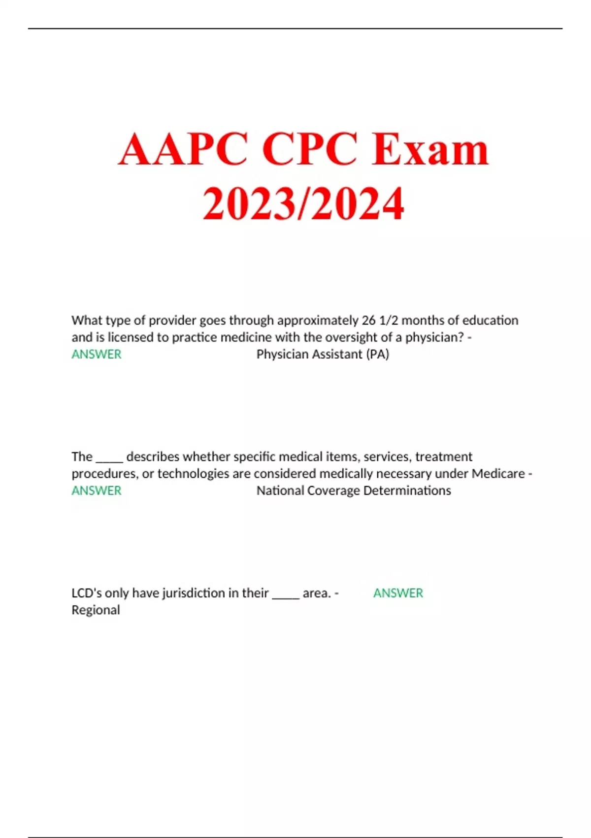 AAPC CPC Exam 2023/2024 What type of provider goes through approximately 26 1/2 months of education and is licensed to practice medicine with the oversight of a physician? - ANSWER Physician Assistant (PA) The ____ describes whether specific medical items, services, treatment procedures, or technologies are considered medically necessary under Medicare - ANSWER National Coverage Determinations LCD's only have jurisdiction in their ____ area. - ANSWER Regional ABN stands for - ANSWER Advance Beneficiary Notice