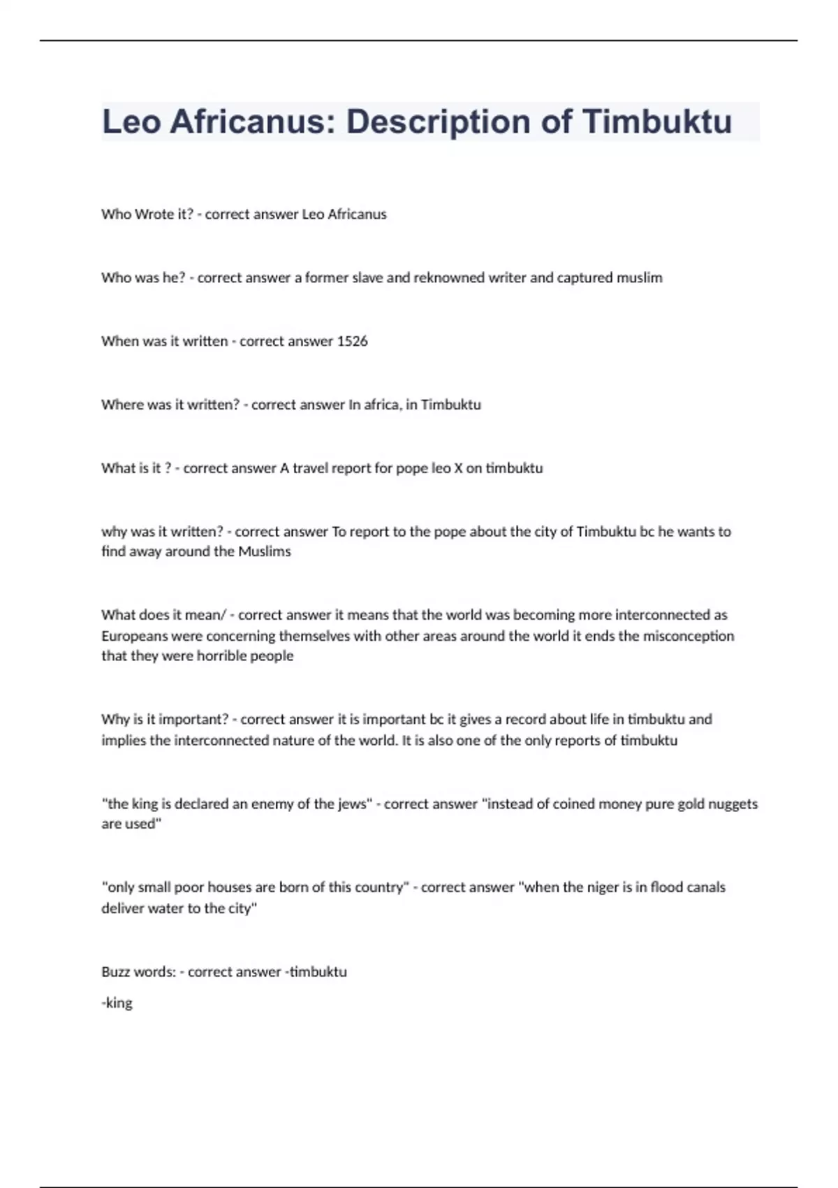Leo Africanus Description of Timbuktu fully solved 2023 passed