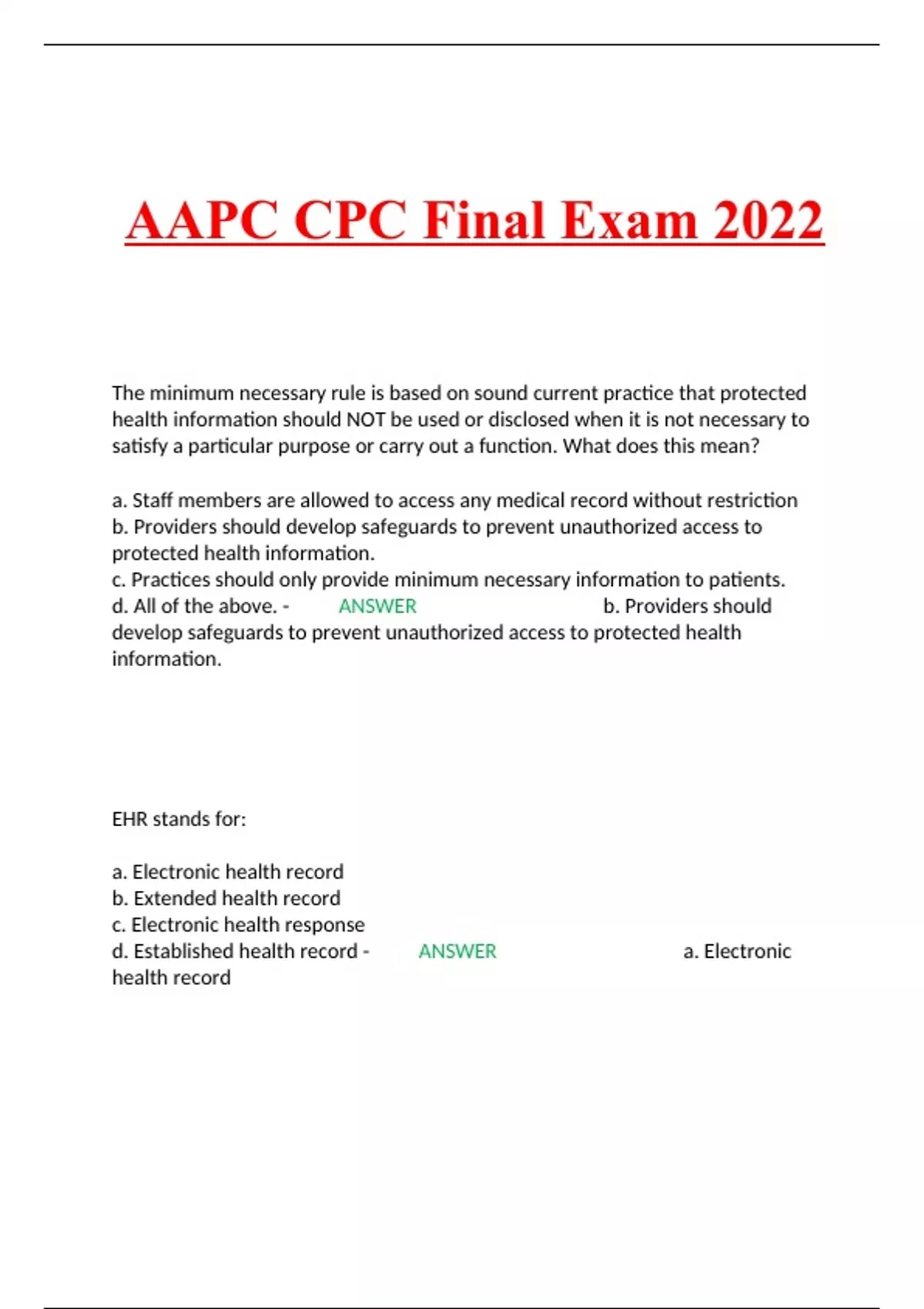 AAPC CPC Final Exam 2022 The minimum necessary rule is based on sound current practice that protected health information should NOT be used or disclosed when it is not necessary to satisfy a particular purpose or carry out a function. What does this mean? a. Staff members are allowed to access any medical record without restriction b. Providers should develop safeguards to prevent unauthorized access to protected health information. c. Practices should only provide minimum necessary information to patients. d. All of the above. - ANSWER b. Providers should develop safeguards to prevent unauthorized access to protected health information. EHR stands for: a. Electronic health record b. Extended health record c. Electronic health response d. Established health record - ANSWER a. Electronic health record