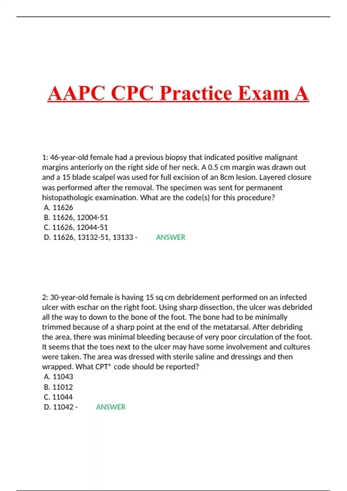 AAPC CPC Practice Exam A 1: 46-year-old female had a previous biopsy that indicated positive malignant margins anteriorly on the right side of her neck. A 0.5 cm margin was drawn out and a 15 blade scalpel was used for full excision of an 8cm lesion. Layered closure was performed after the removal. The specimen was sent for permanent histopathologic examination. What are the code(s) for this procedure? A. 11626 B. 11626, 12004-51 C. 11626, 12044-51 D. 11626, 13132-51, 13133 - ANSWER 2: 30-year-old female is having 15 sq cm debridement performed on an infected ulcer with eschar on the right foot. Using sharp dissection, the ulcer was debrided all the way to down to the bone of the foot. The bone had to be minimally trimmed because of a sharp point at the end of the metatarsal. After debriding the area, there was minimal bleeding because of very poor circulation of the foot. It seems that the toes next to the ulcer may have some involvement and cultures were taken. The area was dressed with sterile saline and dressings and then wrapped. What CPT® code should be reported? A. 11043 B. 11012 C. 11044 D. 11042 - ANSWER
