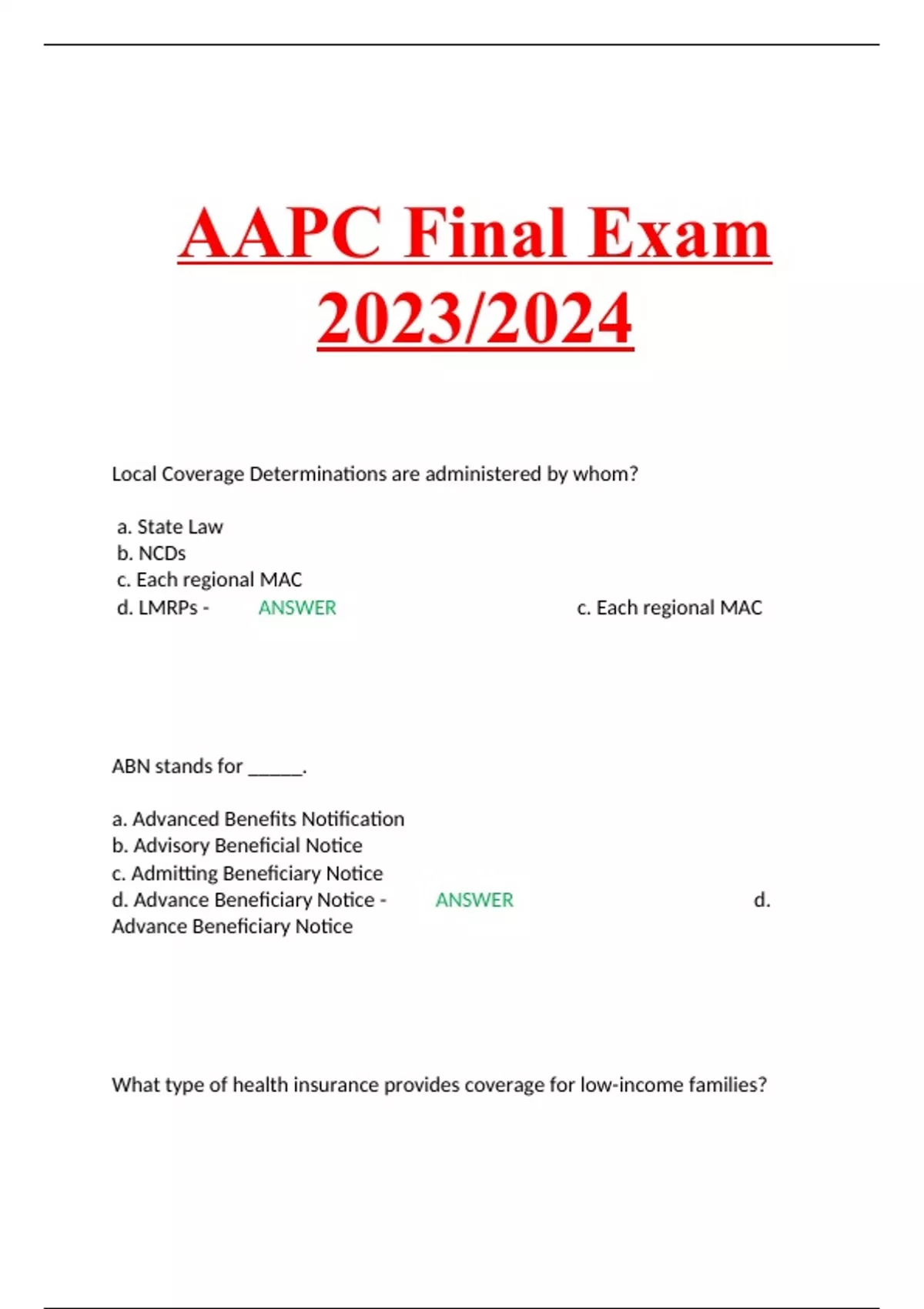 AAPC Final Exam 2023/2024 Local Coverage Determinations are administered by whom? a. State Law b. NCDs c. Each regional MAC d. LMRPs - ANSWER c. Each regional MAC ABN stands for _____. a. Advanced Benefits Notification b. Advisory Beneficial Notice c. Admitting Beneficiary Notice d. Advance Beneficiary Notice - ANSWER d. Advance Beneficiary Notice What type of health insurance provides coverage for low-income families? a. Commercial HMO b. Medicaid c. Medicare d. Commercial PPO - ANSWER b. Medicaid Which type of information is NOT maintained in a medical record? a. Treatment outcomes b. Financial records c. Medical or surgical interventions d. Observations - ANSWER b. Financial records According to the OIG, internal monitoring and auditing should be performed by what means? a. Focused audits on problems brought to the attention of the compliance officer. b. Baseline audits. c. Periodic audits. d. Audits on all denied claims. - ANSWER c. Periodic audits.