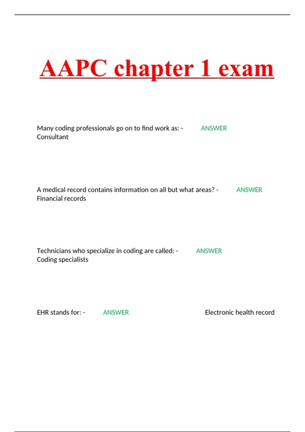 AAPC chapter 1 exam Many coding professionals go on to find work as: - ANSWER Consultant A medical record contains information on all but what areas? - ANSWER Financial records Technicians who specialize in coding are called: - ANSWER Coding specialists EHR stands for: - ANSWER Electronic health record