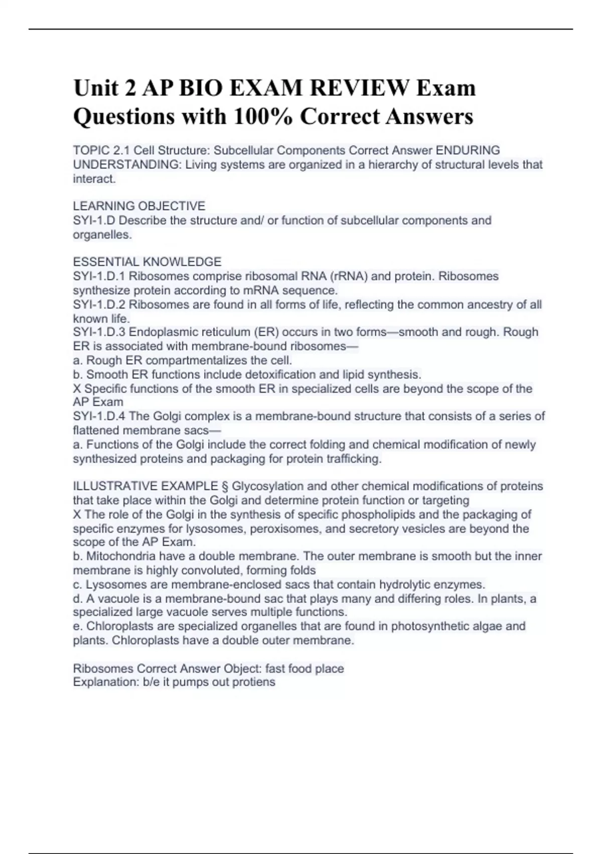 TOPIC 2.1 Cell Structure: Subcellular Components Correct Answer ENDURING UNDERSTANDING: Living systems are organized in a hierarchy of structural levels that interact. LEARNING OBJECTIVE SYI-1.D Describe the structure and/ or function of subcellular components and organelles. ESSENTIAL KNOWLEDGE SYI-1.D.1 Ribosomes comprise ribosomal RNA (rRNA) and protein. Ribosomes synthesize protein according to mRNA sequence. SYI-1.D.2 Ribosomes are found in all forms of life, reflecting the common ancestry of all known life. SYI-1.D.3 Endoplasmic reticulum (ER) occurs in two forms—smooth and rough. Rough ER is associated with membrane-bound ribosomes— a. Rough ER compartmentalizes the cell. b. Smooth ER functions include detoxification and lipid synthesis. X Specific functions of the smooth ER in specialized cells are beyond the scope of the AP Exam SYI-1.D.4 The Golgi complex is a membrane-bound structure that consists of a series of flattened membrane sacs— a. Functions of the Golgi include the correct folding and chemical modification of newly synthesized proteins and packaging for protein trafficking. ILLUSTRATIVE EXAMPLE § Glycosylation and other chemical modifications of proteins that take place within the Golgi and determine protein function or targeting X The role of the Golgi in the synthesis of specific phospholipids and the packaging of specific enzymes for lysosomes, peroxisomes, and secretory vesicles are beyond the scope of the AP Exam. b. Mitochondria have a double membrane. The outer membrane is smooth but the inner membrane is highly convoluted, forming folds c. Lysosomes are membrane-enclosed sacs that contain hydrolytic enzymes. d. A vacuole is a membrane-bound sac that plays many and differing roles. In plants, a specialized large vacuole serves multiple functions. e. Chloroplasts are specialized organelles that are found in photosynthetic algae and plants. Chloroplasts have a double outer membrane. Ribosomes Correct Answer Object: fast food place Explanation: b/e it pumps out protiens