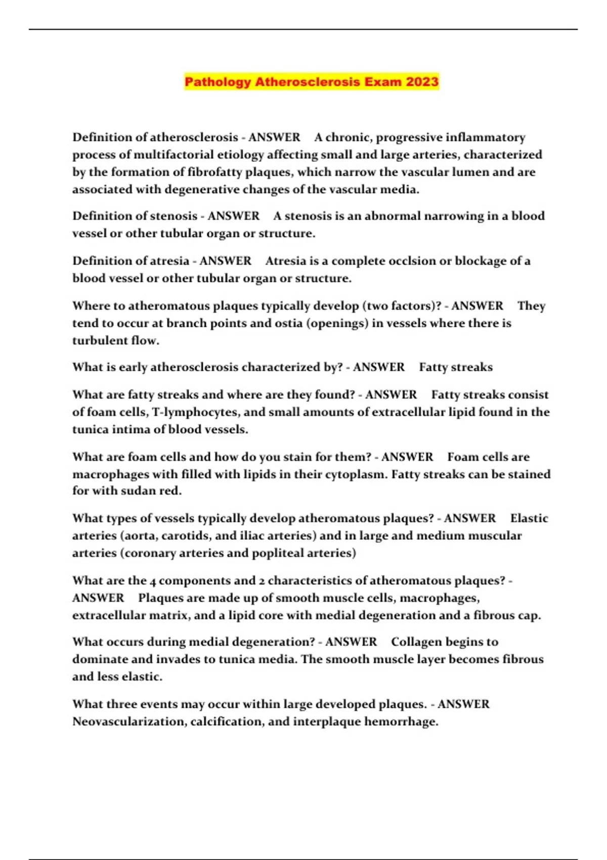 Pathology Atherosclerosis Exam 2023...