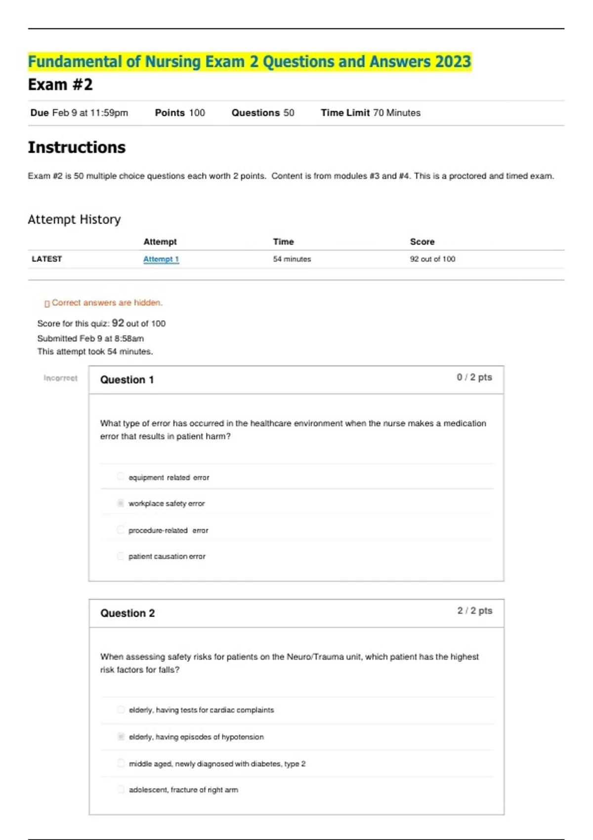 Fundamental of Nursing Exam 2 Questions and Answers 2023 Exam #2 Due Feb 9 at 11:59pm Points 100 Questions 50 Time Limit 70 Minutes Instructions Exam #2 is 50 multiple choice questions each worth 2 points. Content is from modules #3 and #4. This is a proctored and timed exam. Attempt History Attempt Time Score LATEST Attempt 1 54 minutes 92 out of 100 Correct answers are hidden. Score for this quiz: 92 out of 100 Submitted Feb 9 at 8:58am This attempt took 54 minutes. Inncoorrrecctt Question 2 pts When assessing safety risks for patients on the Neuro/Trauma unit, which patient has the highest risk factors for falls? elderly, having tests for cardiac complaints elderly, having episodes of hypotension middle aged, newly diagnosed with diabetes, type 2 adolescent, fracture of right arm Question 1 pts What type of error has occurred in the healthcare environment when the nurse makes a medication error that results in patient harm? equipment related error workplace safety error procedure -related error patient causation error Question 3 pts When assessing for one's fundamental basic needs using Maslow's Hierarchy of Needs, what information is the nurse assessing for with the patient? elimination, sexual preferences, finances self-concept, self-esteem, love self-actualization food, clothing, shelter, comfort Question 4 pts What is a high-level safety consideration for the nurse to assess for during the health history admission intake for an elderly patient who has two chronic diseases and lives alone? accidental poisonings careless smoking resulting in a fire not getting proper vaccinations accidental falls Question 5 pts Why are the use of leather restraints by the nurse as a routine intervention considered a safety risk for an elderly patient who is agitated and confused? it limits the patient's mobility patient is unable to independently use the bathroom high risk of asphyxiation and injury it is a violation of a patient's right to be free with movement Question 6 pts Which nursing diagnosis would be the most appropriate for the nurse to implement for the care plan for an elderly patient, post abdominal surgery, who has an urinary indwelling catheter and a PICC line in the right upper arm? social isolation risk for infection risk for poor nutritional intake spiritual distress Question 7 pts To prevent the spread of infection with nursing care of patients with communicable diseases such as TB or COVID -19, what type of surgical mask is recommended as a personal protective barrier from air borne pathogens? surgical mask any mask that has a 2-ply lining N95 mask droplet protective mask Question 8 pts What type of precautions do nurses and other healthcare personnel need to implement to limit infections regardless of the hospitalized patient's confirmed or suspected illness? standard precautions airborne precautions contact precautions high risk precautions Question 9 pts