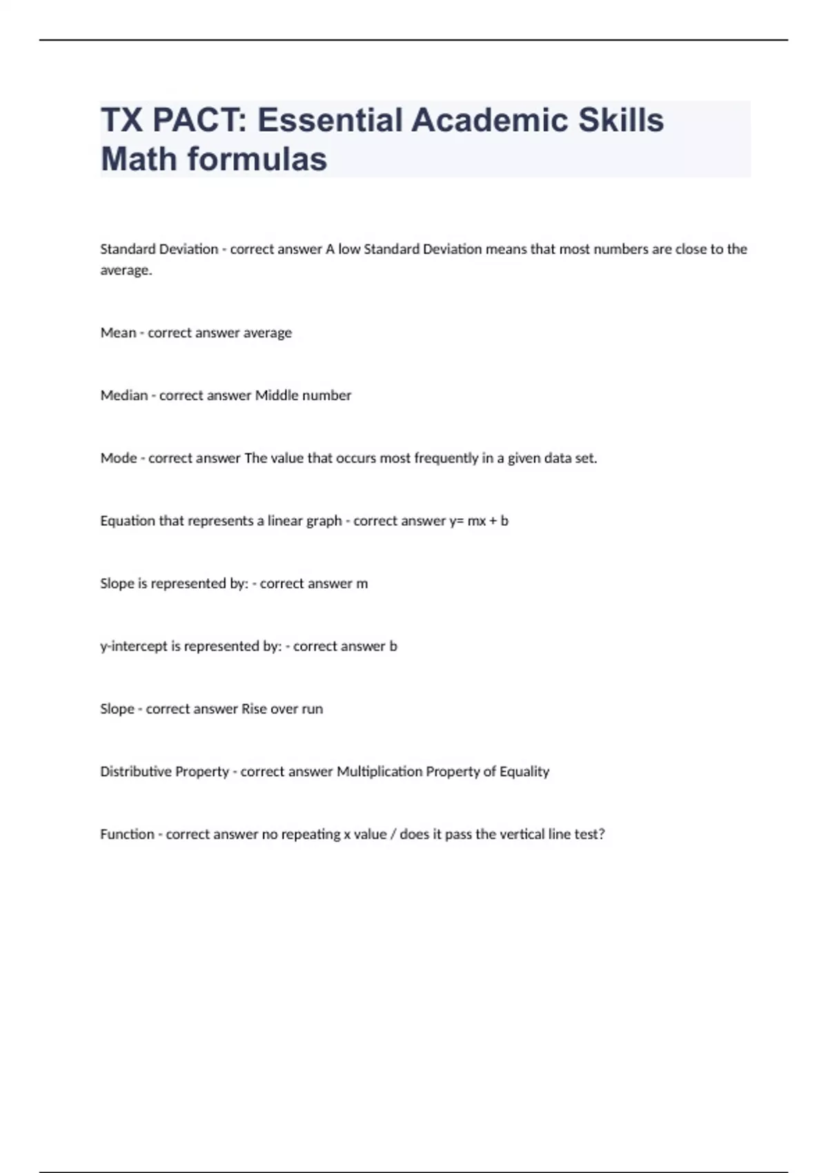 TX PACT Essential Academic Skills Math formulas fully solved graded A+ 2023