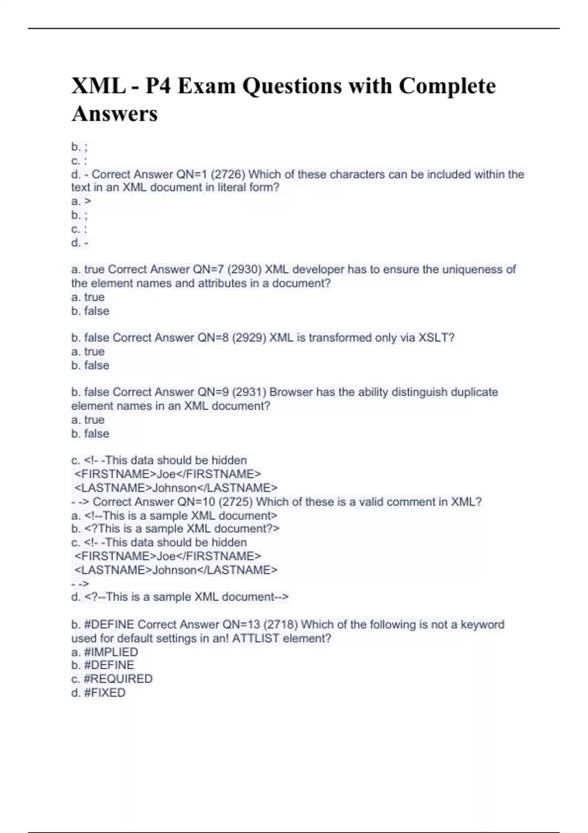 b. ; c. : d. - Correct Answer QN=1 (2726) Which of these characters can be included within the text in an XML document in literal form? a. b. ; c. : d. - a. true Correct Answer QN=7 (2930) XML developer has to ensure the uniqueness of the element names and attributes in a document? a. true b. false b. false Correct Answer QN=8 (2929) XML is transformed only via XSLT? a. true b. false b. false Correct Answer QN=9 (2931) Browser has the ability distinguish duplicate element names in an XML document? a. true b. false c. !- -This data should be hidden FIRSTNAMEJoe/FIRSTNAME LASTNAMEJohnson/LASTNAME - - Correct Answer QN=10 (2725) Which of these is a valid comment in XML? a. !--This is a sample XML document b. ?This is a sample XML document? c. !- -This data should be hidden FIRSTNAMEJoe/FIRSTNAME LASTNAMEJohnson/LASTNAME - - d. ?--This is a sample XML document-- b. #DEFINE Correct Answer QN=13 (2718) Which of the following is not a keyword used for default settings in an! ATTLIST element? a. #IMPLIED b. #DEFINE c. #REQUIRED d. #FIXED