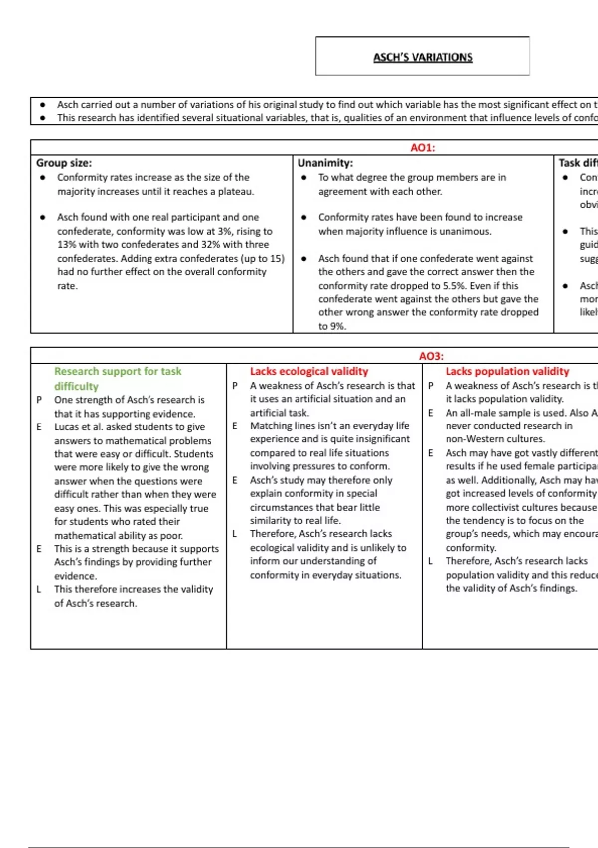 P One strength of Asch’s research is it uses an artificial situation and an it lacks population validity.