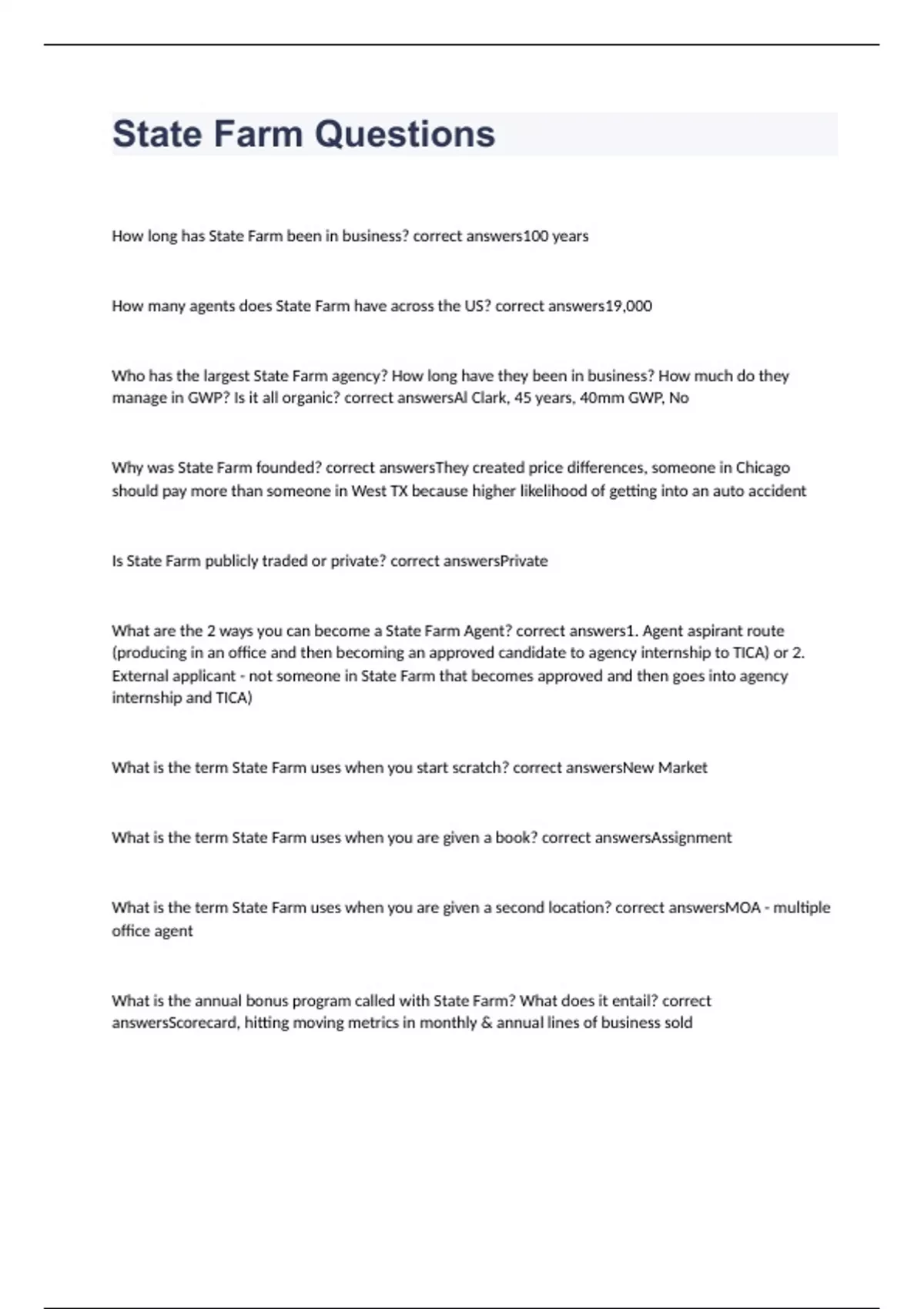 How long has State Farm been in business? correct answers100 years How many agents does State Farm have across the US? correct answers19,000 Who has the largest State Farm agency? How long have they been in business? How much do they manage in GWP? Is it all organic? correct answersAl Clark, 45 years, 40mm GWP, No Why was State Farm founded? correct answersThey created price differences, someone in Chicago should pay more than someone in West TX because higher likelihood of getting into an auto accident Is State Farm publicly traded or private? correct answersPrivate What are the 2 ways you can become a State Farm Agent? correct answers1. Agent aspirant route (producing in an office and then becoming an approved candidate to agency internship to TICA) or 2. External applicant - not someone in State Farm that becomes approved and then goes into agency internship and TICA) What is the term State Farm uses when you start scratch? correct answersNew Market What is the term State Farm uses when you are given a book? correct answersAssignment What is the term State Farm uses when you are given a second location? correct answersMOA - multiple office agent What is the annual bonus program called with State Farm? What does it entail? correct answersScorecard, hitting moving metrics in monthly & annual lines of business sold