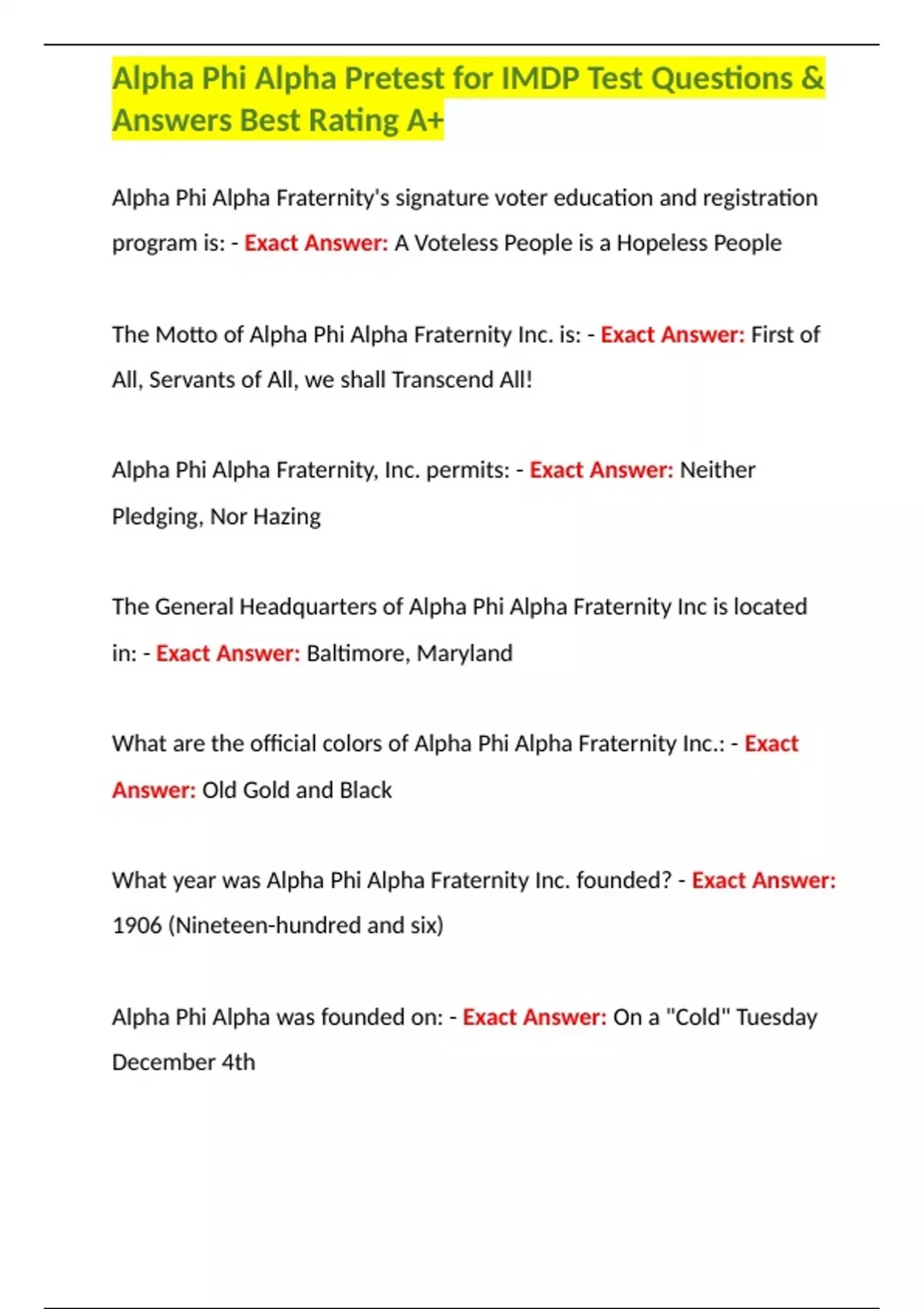 Alpha Phi Alpha Pretest for IMDP Test Questions & Answers Best Rating A+
