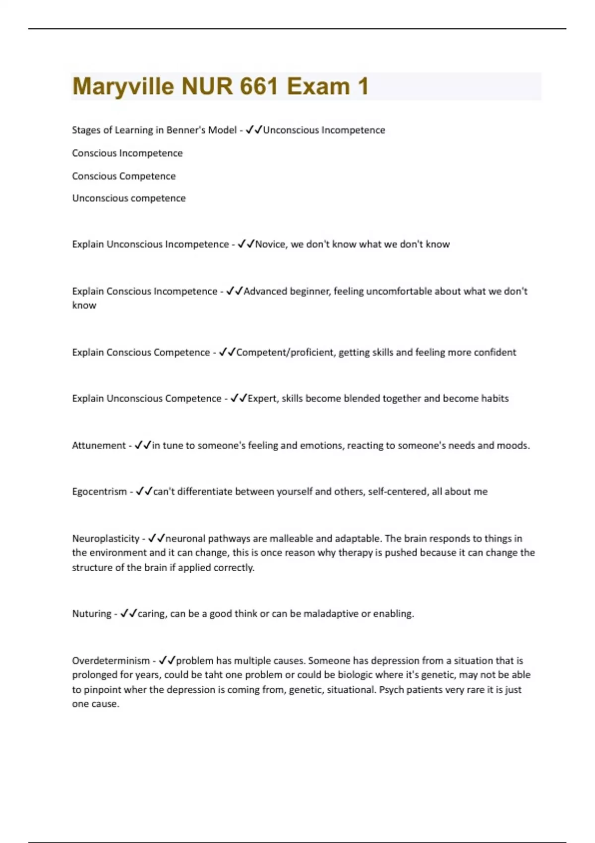 Stages of Learning in Benner's Model - Unconscious Incompetence Conscious Incompetence Conscious Competence Unconscious competence Explain Unconscious Incompetence - Novice, we don't know what we don't know Explain Conscious Incompetence - Advanced beginner, feeling uncomfortable about what we don't know Explain Conscious Competence - Competent/proficient, getting skills and feeling more confident Explain Unconscious Competence - Expert, skills become blended together and become habits Attunement - in tune to someone's feeling and emotions, reacting to someone's needs and moods. Egocentrism - can't differentiate between yourself and others, self-centered, all about me Neuroplasticity - neuronal pathways are malleable and adaptable. The brain responds to things in the environment and it can change, this is once reason why therapy is pushed because it can change the structure of the brain if applied correctly. Nuturing - caring, can be a good think or can be maladaptive or enabling. Overdeterminism - problem has multiple causes. Someone has depression from a situation that is prolonged for years, could be taht one problem or could be biologic where it's genetic, may not be able to pinpoint wher the depression is coming from, genetic, situational. Psych patients very rare it is just one cause.Resilience - able to adapt very well, can go through a traumatic event and maintain good coping skills and mental health. What is the biomedical holistic model and what is it used for? - Biomedical model focuses on the goal of healing, seeing the body as a whole, seeing both medical and holistic side. Biomedical model treats symptoms, holistic model treats as a whole, this is combination of both. What is the Adaptive Information Processing Model - Taking information through schemas. The way information is processed. Information is taken in through senses and connected adaptively to memory networks so that storing and learning can occur.If brain processing is interrupted due to the massive influx of hormone and neurotransmitter, these unprocessed experiences are considered to be the basis of the symptoms and of many mental health problems. Once information process is interrupted the memory of the event becomes fragmented and the experience may become disconnected (a women raped 40 years ago triggered by having sex withe her partner, etc.)._