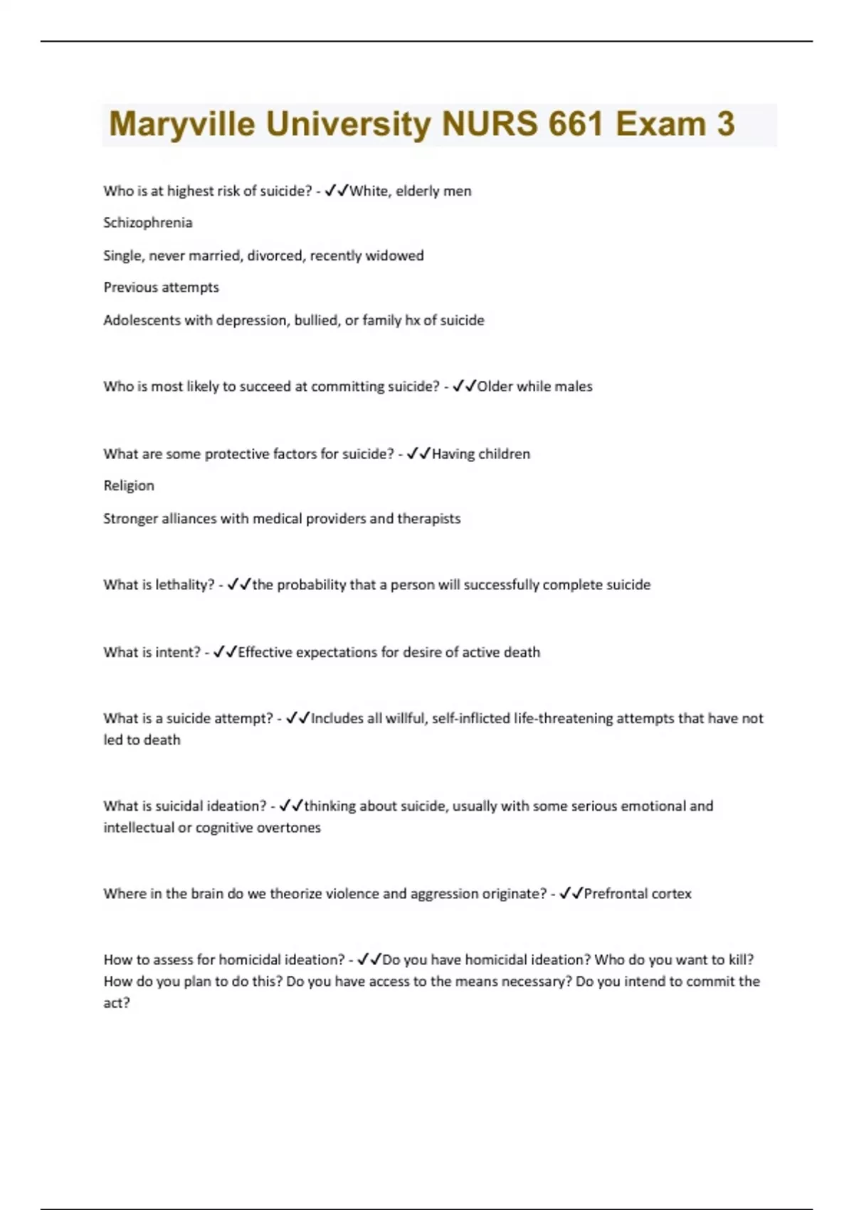 Who is at highest risk of suicide? - White, elderly men Schizophrenia Single, never married, divorced, recently widowed Previous attempts Adolescents with depression, bullied, or family hx of suicide Who is most likely to succeed at committing suicide? - Older while males What are some protective factors for suicide? - Having children Religion Stronger alliances with medical providers and therapists What is lethality? - the probability that a person will successfully complete suicide What is intent? - Effective expectations for desire of active death What is a suicide attempt? - Includes all willful, self-inflicted life-threatening attempts that have not led to death What is suicidal ideation? - thinking about suicide, usually with some serious emotional and intellectual or cognitive overtones Where in the brain do we theorize violence and aggression originate? - Prefrontal cortex How to assess for homicidal ideation? - Do you have homicidal ideation? Who do you want to kill? How do you plan to do this? Do you have access to the means necessary? Do you intend to commit the act?What legal follow up is needed for homicidal ideation? - Duty to warn Based on state laws Obsession - 1. Recurrent and persistent thoughts, urges, or images that are experienced, at some time during the disturbance, as intrusive and unwanted, and that in most individuals cause marked anxiety or distress
