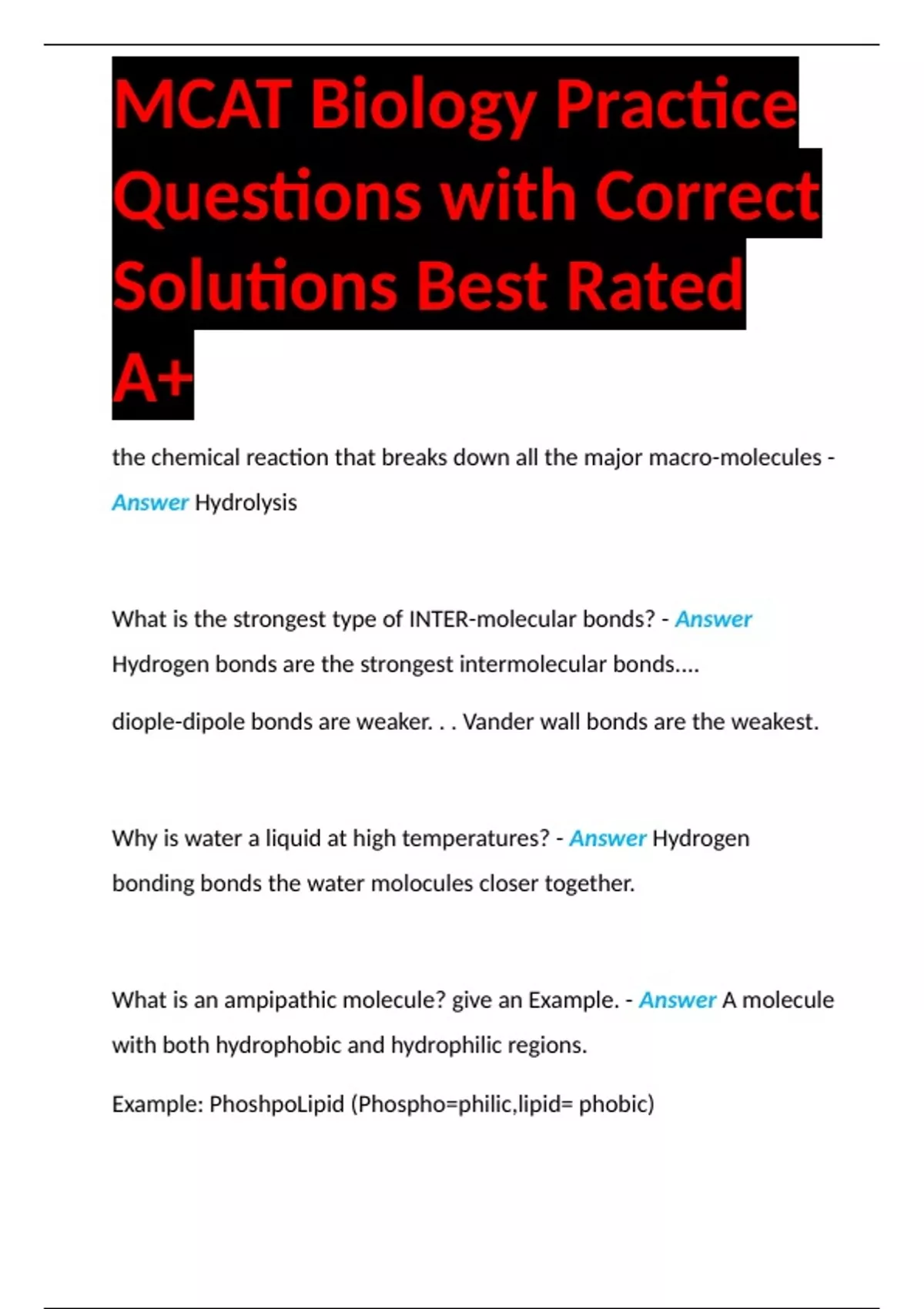 MCAT Biology Practice Questions with Correct Solutions Best Rated A+
