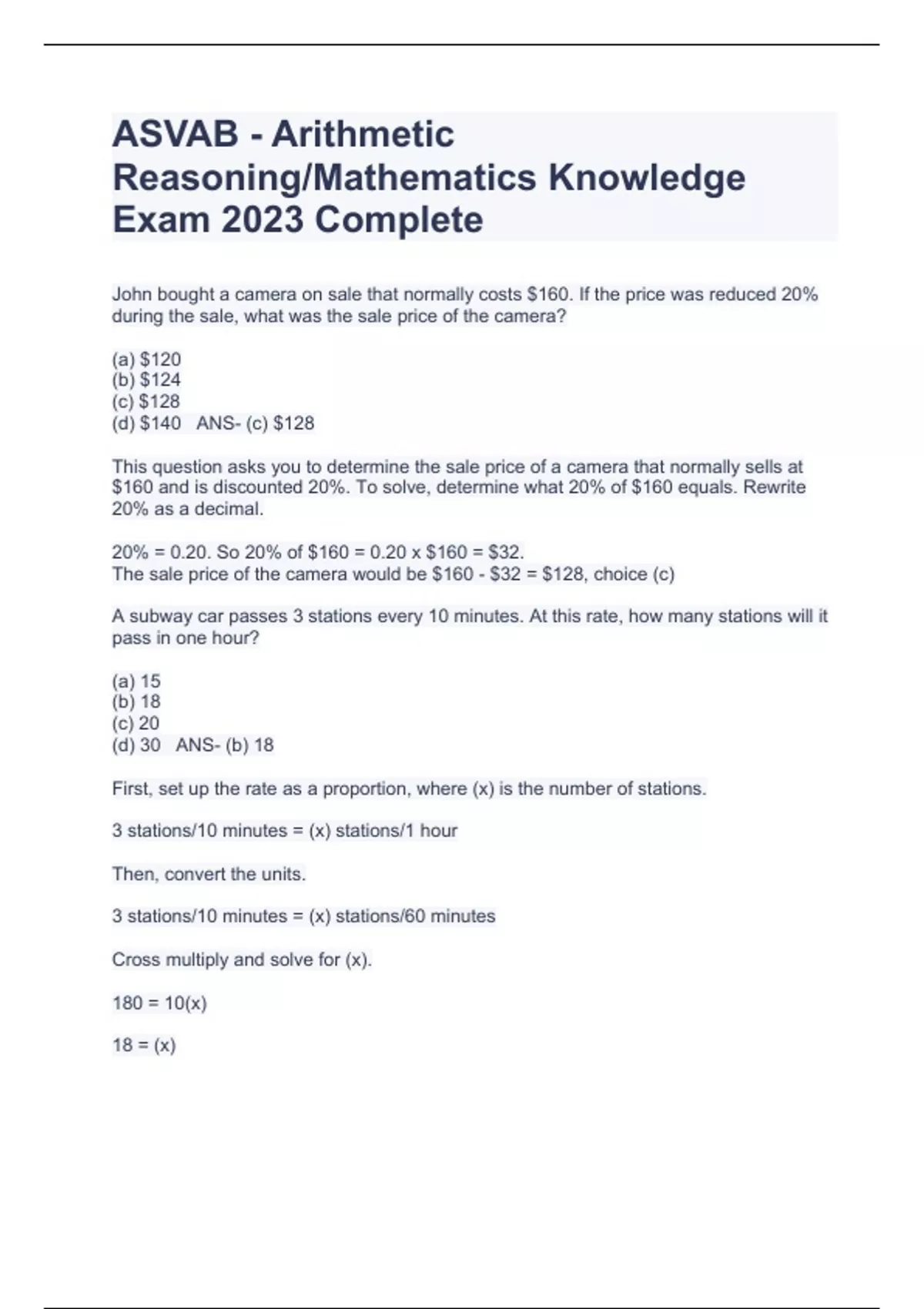 ASVAB - Arithmetic Reasoning/Mathematics Knowledge Exam 2023 Complete