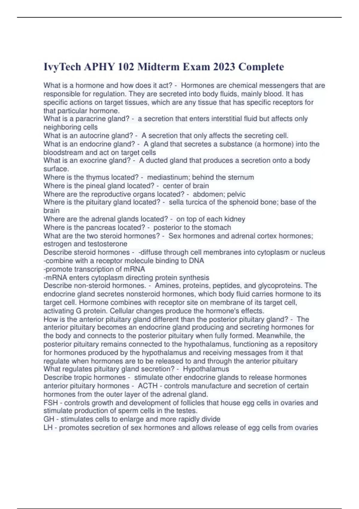 IvyTech APHY 102 Midterm Exam 2023 Complete What is a hormone and how does it act? - Hormones are chemical messengers that are responsible for regulation. They are secreted into body fluids, mainly blood. It has specific actions on target tissues, which are any tissue that has specific receptors for that particular hormone. What is a paracrine gland? - a secretion that enters interstitial fluid but affects only neighboring cells What is an autocrine gland? - A secretion that only affects the secreting cell. What is an endocrine gland? - A gland that secretes a substance (a hormone) into the bloodstream and act on target cells What is an exocrine gland? - A ducted gland that produces a secretion onto a body surface. Where is the thymus located? - mediastinum; behind the sternum Where is the pineal gland located? - center of brain Where are the reproductive organs located? - abdomen; pelvic Where is the pituitary gland located? - sella turcica of the sphenoid bone; base of the brain Where are the adrenal glands located? - on top of each kidney Where is the pancreas located? - posterior to the stomach What are the two steroid hormones? - Sex hormones and adrenal cortex hormones; estrogen and testosterone Describe steroid hormones - -diffuse through cell membranes into cytoplasm or nucleus -combine with a receptor molecule binding to DNA -promote transcription of mRNA -mRNA enters cytoplasm directing protein synthesis Describe non-steroid hormones. - Amines, proteins, peptides, and glycoproteins. The endocrine gland secretes nonsteroid hormones, which body fluid carries hormone to its target cell. Hormone combines with receptor site on membrane of its target cell, activating G protein. Cellular changes produce the hormone's effects. How is the anterior pituitary gland different than the posterior pituitary gland? - The anterior pituitary becomes an endocrine gland producing and secreting hormones for the body and connects to the posterior pituitary when fully formed. Meanwhile, the posterior pituitary remains connected to the hypothalamus, functioning as a repository for hormones produced by the hypothalamus and receiving messages from it that regulate when hormones are to be released to and through the anterior pituitary What regulates pituitary gland secretion? - Hypothalamus Describe tropic hormones - stimulate other endocrine glands to release hormones anterior pituitary hormones - ACTH - controls manufacture and secretion of certain hormones from the outer layer of the adrenal gland. FSH - controls growth and development of follicles that house egg cells in ovaries and stimulate production of sperm cells in the testes. GH - stimulates cells to enlarge and more rapidly divide LH - promotes secretion of sex hormones and allows release of egg cells from ovaries PRL - promotes milk production TSH - controls secretion of certain hormones from the thyroid posterior pituitary hormones - ADH - reduces volume of water that kidneys secrete Oxytocin - smooth muscle contraction and allows contraction of the uterus during childbirth and may stimulate the movement of certain fluids in the male reproductive tract during sexual activity Thyroid hormones - Calcitonin - controls blood calcium and phosphate ion concentration Thyroxine(T4) - more prevalent in circulation Triiodothyronine(T3) - more potent than T4 Parathyroid hormones - PTH - increases blood calcium ion concentration and decreases blood phosphate ion concentration through actions in the bones, kidneys, and intestines adrenal medulla hormones - epinephrine and norepinephrine - increase heart rate, BP, breathing, decrease digestion adrenal cortex hormones - Aldosterone - helps regulate concentration of sodium and potassium ions Cortisol - affects glucose metabolism and influences proteins and fat metabolism Pancreas hormones - Glucagon - stimulates liver to break down glycogen into glucose Insulin - stimulates the liver to form glycogen from glucose Somatostatin - helps regulate glucose metabolism by inhibiting secretion of glucagon and insulin pineal gland hormone - Melatonin - made from serotonin and regulates circadian rhythms Thymus Gland Hormones - Thymosins - affect production and differentiation of T lymphocytes How are glucagon and insulin alike? - Both work to keep blood glucose concentration constant How are glucagon and insulin different? - Glucagon stimulates the liver to break down glycogen into glucose and insulin promotes the formation of glycogen from glucose How is diabetes insipitus different from diabetes mellitus? - Diabetes insipitus - a person is insatiably thirsty and has large amounts of urine output Diabetes mellitus - two types (type 1 and type 2). Type 1 occurs when body makes no insulin. Type 2 occurs when the body reaches insulin resistance How are pheromones different than hormones? - Pheromones are a type of hormone that are released in small quantities and play a big role in physical attraction between people. How does aging affect the endocrine system? - As people get older, their endocrine glands decrease in size, muscular strength decreases as GH levels decrease, ADH levels increase due to slower breakdown in liver & kidneys. Calcitonin levels decrease, and insulin resistance may develop. Describe normal blood: number of each cell type, pH. - Blood is about 8% of body weight. Adult blood volume is about 5 L. RBC count is usually 4,600,000-6,200,000 in males, 4,200,000-5,400,000 in females. WBC are usually 5,000-10,000 per cubic mm of blood. Platelets are usually 130,000-360,000 per cubic mm of blood. Normal blood pH is around 7.4. Describe the different formed elements and their origins - RBCs originate in red bone marrow from hemocytoblasts (stem cells) which then differentiate in a process called hematopoiesis. WBCs are called leukocytes and are split into granulocytes and agranulocytes. Platelets are cell fragments of megakaryocytes; they lack a nucleus and are half the size of a RBC. Compare the formed e