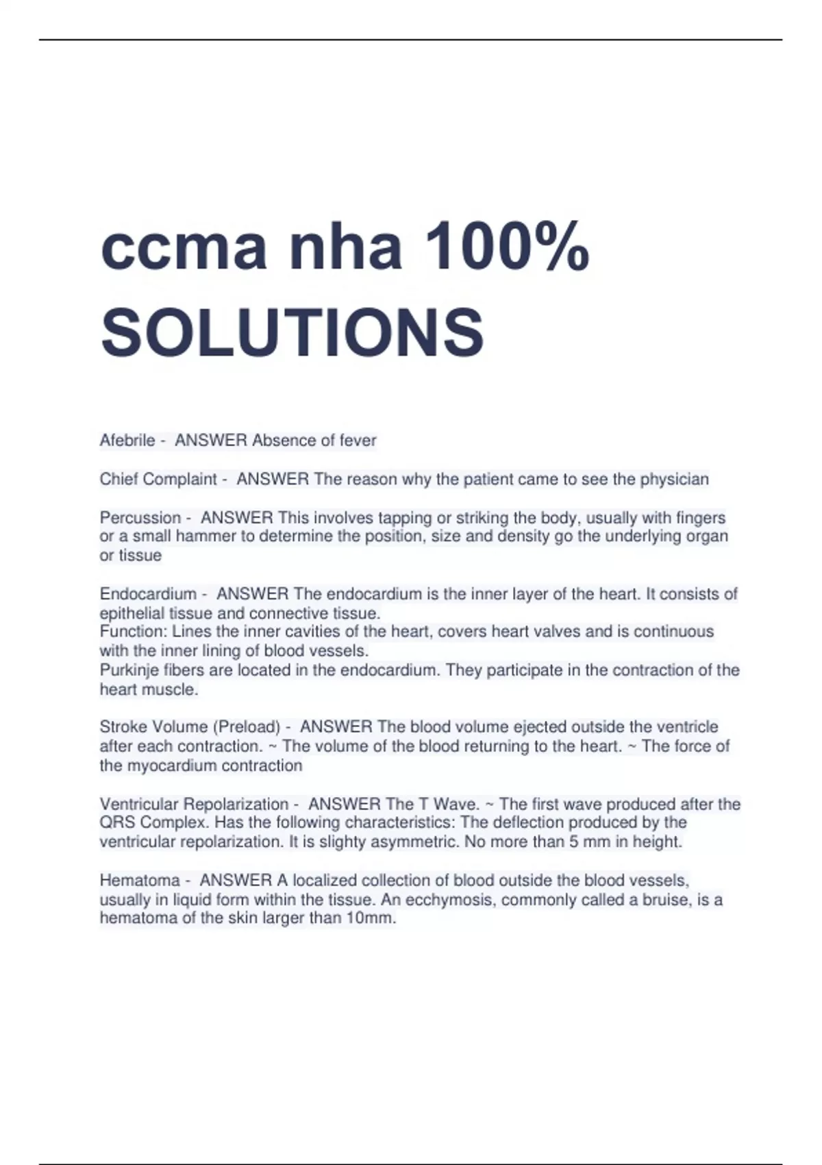 ccma nha 100% SOLUTIONS Afebrile - ANSWER Absence of fever Chief Complaint - ANSWER The reason why the patient came to see the physician Percussion - ANSWER This involves tapping or striking the body, usually with fingers or a small hammer to determine the position, size and density go the underlying organ or tissue Endocardium - ANSWER The endocardium is the inner layer of the heart. It consists of epithelial tissue and connective tissue. Function: Lines the inner cavities of the heart, covers heart valves and is continuous with the inner lining of blood vessels. Purkinje fibers are located in the endocardium. They participate in the contraction of the heart muscle. Stroke Volume (Preload) - ANSWER The blood volume ejected outside the ventricle after each contraction. ~ The volume of the blood returning to the heart. ~ The force of the myocardium contraction Ventricular Repolarization - ANSWER The T Wave. ~ The first wave produced after the QRS Complex. Has the following characteristics: The deflection produced by the ventricular repolarization. It is slighty asymmetric. No more than 5 mm in height. Hematoma - ANSWER A localized collection of blood outside the blood vessels, usually in liquid form within the tissue. An ecchymosis, commonly called a bruise, is a hematoma of the skin larger than 10mm. (acronym.) BeCause Better Specimens, Y'all, Generate Perfect Goals - ANSWER Order of draw (per NHA): Blood Cultures, Blue (light), Serum (red), Yellow, Green, Purple (Lavender), Gray Gram Stain - ANSWER A method of differentiating bacterial species into two large groups (gram-positive and gram-negative). Gram staining differentiates bacteria by the chemical and physical properties of their cell walls by detecting peptidoglycan, which is present in a thick layer in gram-positive bacteria. The Gram stain is almost always the first step in the identification of a bacterial organism. Axillary - ANSWER Under the arm (armpit) Throat culture - ANSWER A laboratory diagnostic test to find a bacterial or fungal infection in the throat. Sampling is performed by throat swab, and the sample is put in a special cup (culture) that allows infections to grow. If an infection grows, the culture is positive. The type of infection is found using a microscope, chemical tests, or both. If no infection grows, the culture is negative. Tort - ANSWER A tort, in common law jurisdictions, is a civil wrong[1] which unfairly causes someone else to suffer loss or harm resulting in legal liability for the person : Battery, Invasion of privacy, defamation of character Artifact - ANSWER Unwanted interference or jitter on the EKG recording. This makes the EKG reading difficult or impossible, as well as can lead to a misdiagnosis. AV (atriventricular) Valves - ANSWER Located between the atria and ventricles. AV cusped valves characteristics are: They have tough fibrous rings, long and strong leaflets (cuspids), They are accessory organs (like papillary muscles and chordae tendinae) Standard Precautions - ANSWER Standard Precautions are the minimum infection prevention practices that apply to all patient care, regardless of suspected or confirmed infection status of the patient, in any setting where healthcare is delivered. Standard Precautions include: 1) hand hygiene, 2) use of personal protective equipment (e.g., gloves, gowns, masks), 3) safe injection practices, 4) safe handling of potentially contaminated equipment or surfaces in the patient environment, and 5) respiratory hygiene/cough etiquette. Parasympathetic (Vagus Nerve) - ANSWER Generally has an inhibitory effect via the neurotransmitter Acetylcholine which may cause the following to happen: *Slows down pacemaker and HR *Slows the conduction of electricity in AV node *Decreases the strength of atrial and ventricular contraction. Infection Control/ Chain of Infection - ANSWER This consists of links, each of which is necessary for the infectious disease to spread. Infection control is based on the fact that the transmission of infectious diseases will be prevented or stopped when any level in the chain is broken or interrupted. AGENT ------- MODE OF TRANSMISSION --------- SUSCEPTIBLE HOST ---------- PORTAL OF EXIT -------- PORTAL OF ENTRY Medical Asepsis - ANSWER Involves procedures and practices that reduce the number and transfer of pathogens. For example, performing hand hygiene and wearing gloves, nothing on floor, clean from least soiled to most soiled. Urinary Bacteria - ANSWER Enteric gram-negative bacteria that are always nitrite positive can convert urinary nitrate to nitrite. A positive nitrite test is an indication that a significant number of bacteria are present in the urine. PKU - ANSWER This test is ordered for infants to detect phenylketonuria, a genetic disease that causes mental retardation and brain damage. Test is done on blood from newborn's heel or in urine. Accessioning Order - ANSWER Each request for blood withdrawl must include accessioning order, number for paper work, and supplies and patients identification. The blood request forms should include the following: Patient's name and age from ID plate or wristband, Identification number, date & time the specimen is obtained, name or initials of person who obtains specimen, accessioning number, Physician's name, department for which which work is being done, other useful info (special comments, unusual sampling site, drawn near Iv site...) Cold agglutinins - ANSWER antibodies produced in response to atypical pneumonia,