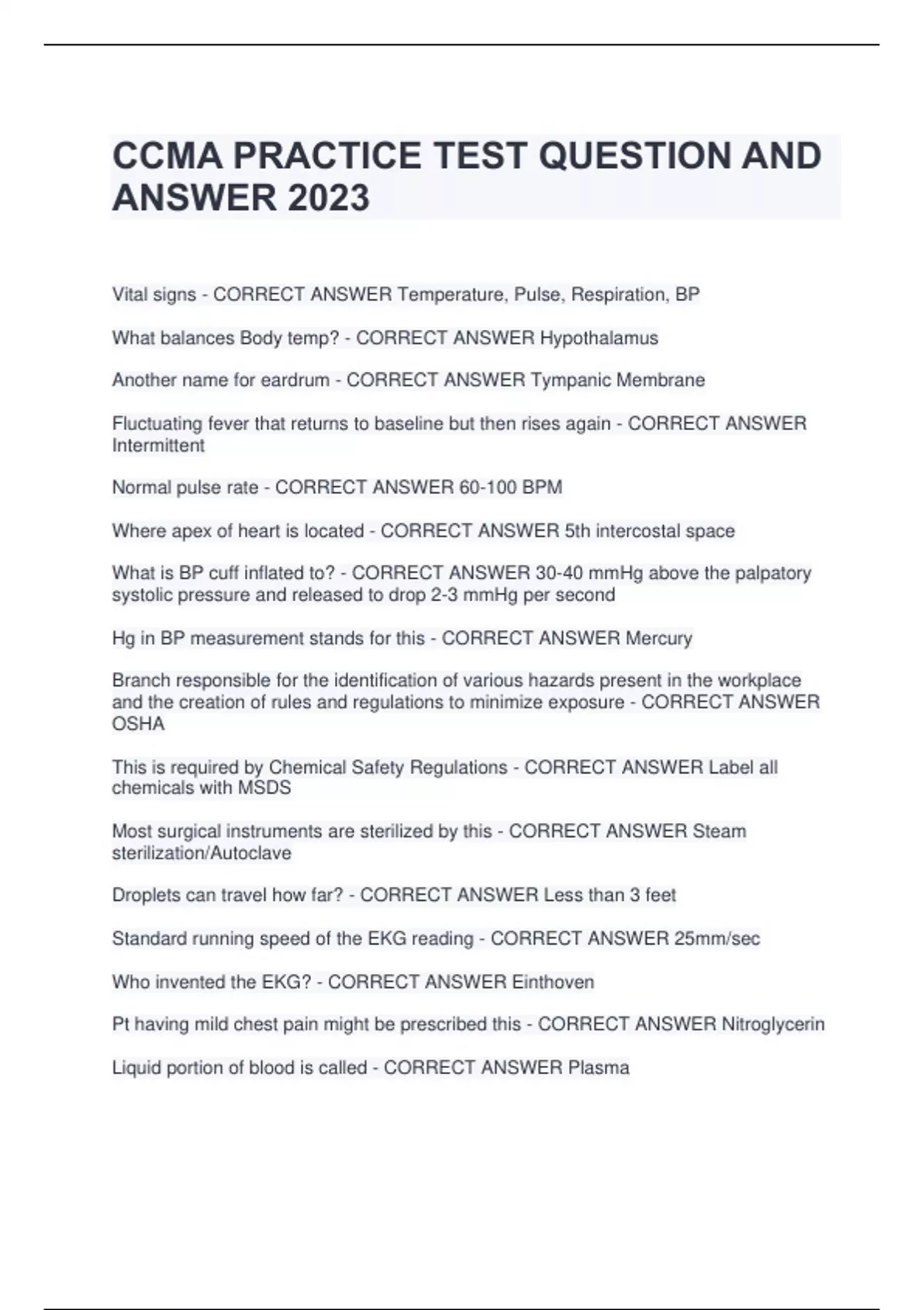 CCMA PRACTICE TEST QUESTION AND ANSWER 2023 Vital signs - CORRECT ANSWER Temperature, Pulse, Respiration, BP What balances Body temp? - CORRECT ANSWER Hypothalamus Another name for eardrum - CORRECT ANSWER Tympanic Membrane Fluctuating fever that returns to baseline but then rises again - CORRECT ANSWER Intermittent Normal pulse rate - CORRECT ANSWER 60-100 BPM Where apex of heart is located - CORRECT ANSWER 5th intercostal space What is BP cuff inflated to? - CORRECT ANSWER 30-40 mmHg above the palpatory systolic pressure and released to drop 2-3 mmHg per second Hg in BP measurement stands for this - CORRECT ANSWER Mercury Branch responsible for the identification of various hazards present in the workplace and the creation of rules and regulations to minimize exposure - CORRECT ANSWER OSHA This is required by Chemical Safety Regulations - CORRECT ANSWER Label all chemicals with MSDS Most surgical instruments are sterilized by this - CORRECT ANSWER Steam sterilization/Autoclave Droplets can travel how far? - CORRECT ANSWER Less than 3 feet Standard running speed of the EKG reading - CORRECT ANSWER 25mm/sec Who invented the EKG? - CORRECT ANSWER Einthoven Pt having mild chest pain might be prescribed this - CORRECT ANSWER Nitroglycerin Liquid portion of blood is called - CORRECT ANSWER Plasma Thromobocytes assist in - CORRECT ANSWER Clotting Government based health insurance for people over 65 and others with certain disabilities - CORRECT ANSWER Medicare CPR Ratio - CORRECT ANSWER 30 Compressions : 2 Breaths Medical Asepsis - CORRECT ANSWER The destruction of pathogenic microorganisms AFTER they leave the body through Standard Precautions and Transmission Based Precautions Standard Precautions and Transmission-based Precautions are control measures aimed at preventing the spread of disease at what point in the Chain of Infection - CORRECT ANSWER Portal of Exit Organization that issued the guidelines known as Standard and Universal Precautions - CORRECT ANSWER CDC Because of the nature of airborne precautions this is needed to prevent transmission - CORRECT ANSWER Ventilation Where you would find the spelling for a medication? - CORRECT ANSWER Physician Desk Reference Where is V2 lead located - CORRECT ANSWER 4th intercostal space, left sternal border Where is V5 lead located - CORRECT ANSWER 5th intercostal space, anterior axillary line Poor tracings due to sweat or lotion would lead to this on an EKG - CORRECT ANSWER Wandering baseline Most critical step in pt testing - CORRECT ANSWER Identifying the pt Which urinalysis would you use to test for bacteria? - CORRECT ANSWER Clean Catch Specimen Codes used to describe encounters with circumstances other than disease or injury - CORRECT ANSWER ICD-9 Supplemental codes that capture the external cause of injury or poisoning, the intent and the place it occured - CORRECT ANSWER E codes The sounds an MA listens for during a BP - CORRECT ANSWER Korotkoff sounds CMS-1500 Form is aka - CORRECT ANSWER Superbill Post-prandial - CORRECT ANSWER After a mea