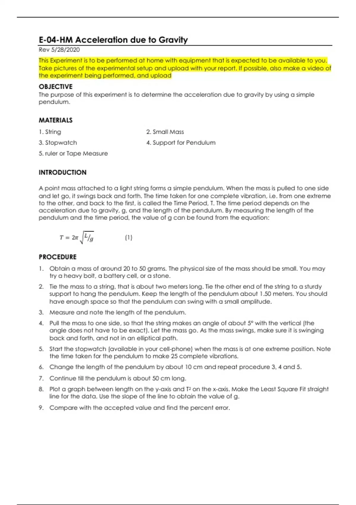 Acceleration due to Gravity Lab No. 9