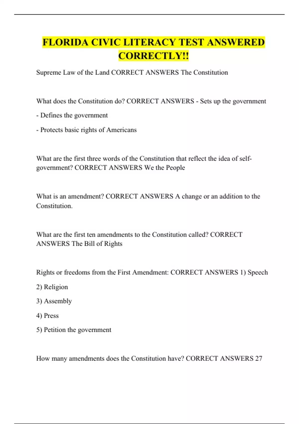 FLORIDA CIVIC LITERACY TEST ANSWERED CORRECTLY!!