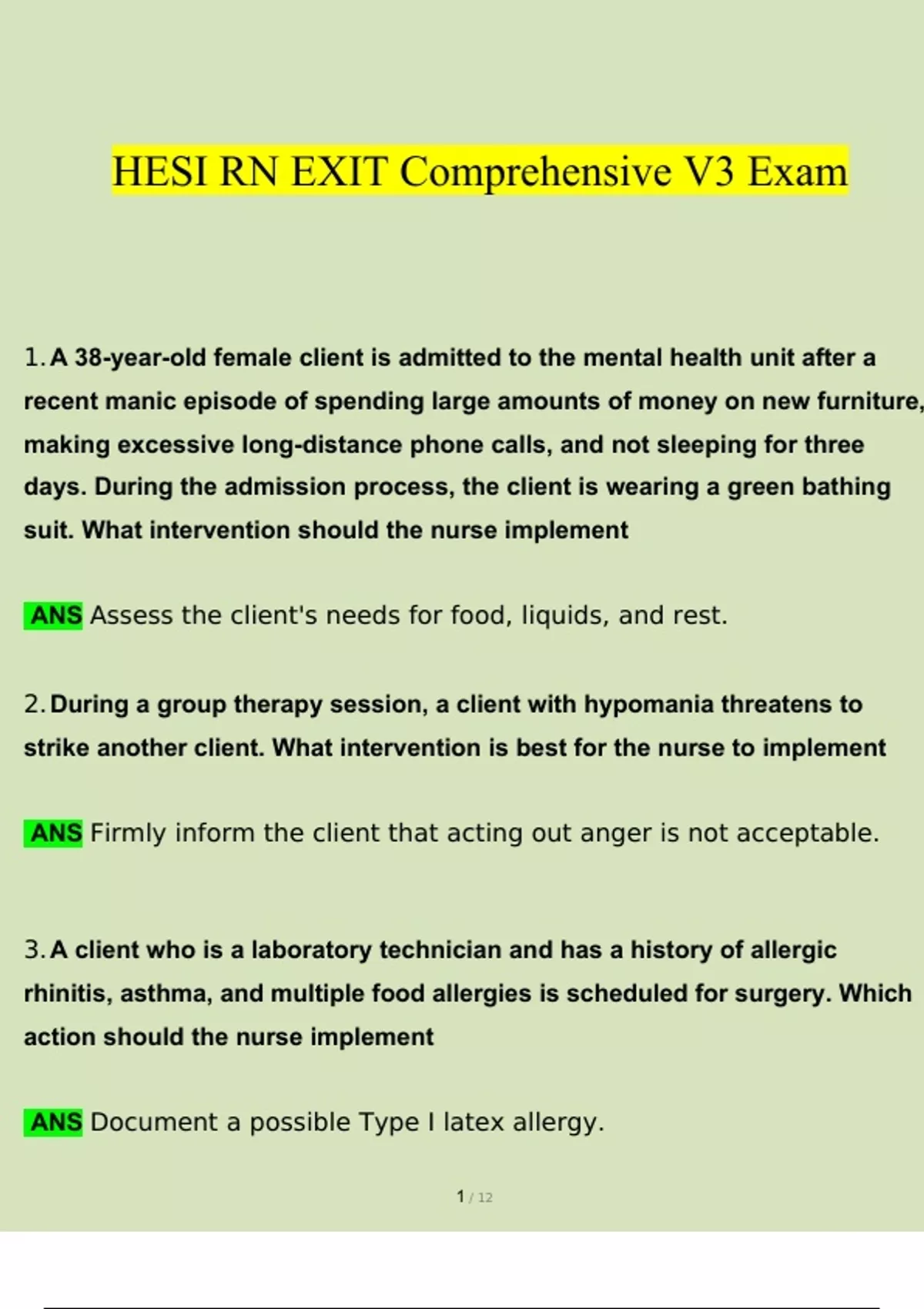 HESI RN Exit Comprehensive V3 Exam Questions and Answers () (Verified by Expert) HESI RN Exit Comprehensive V3 Exam Questions and Answers () (Verified by Expert)