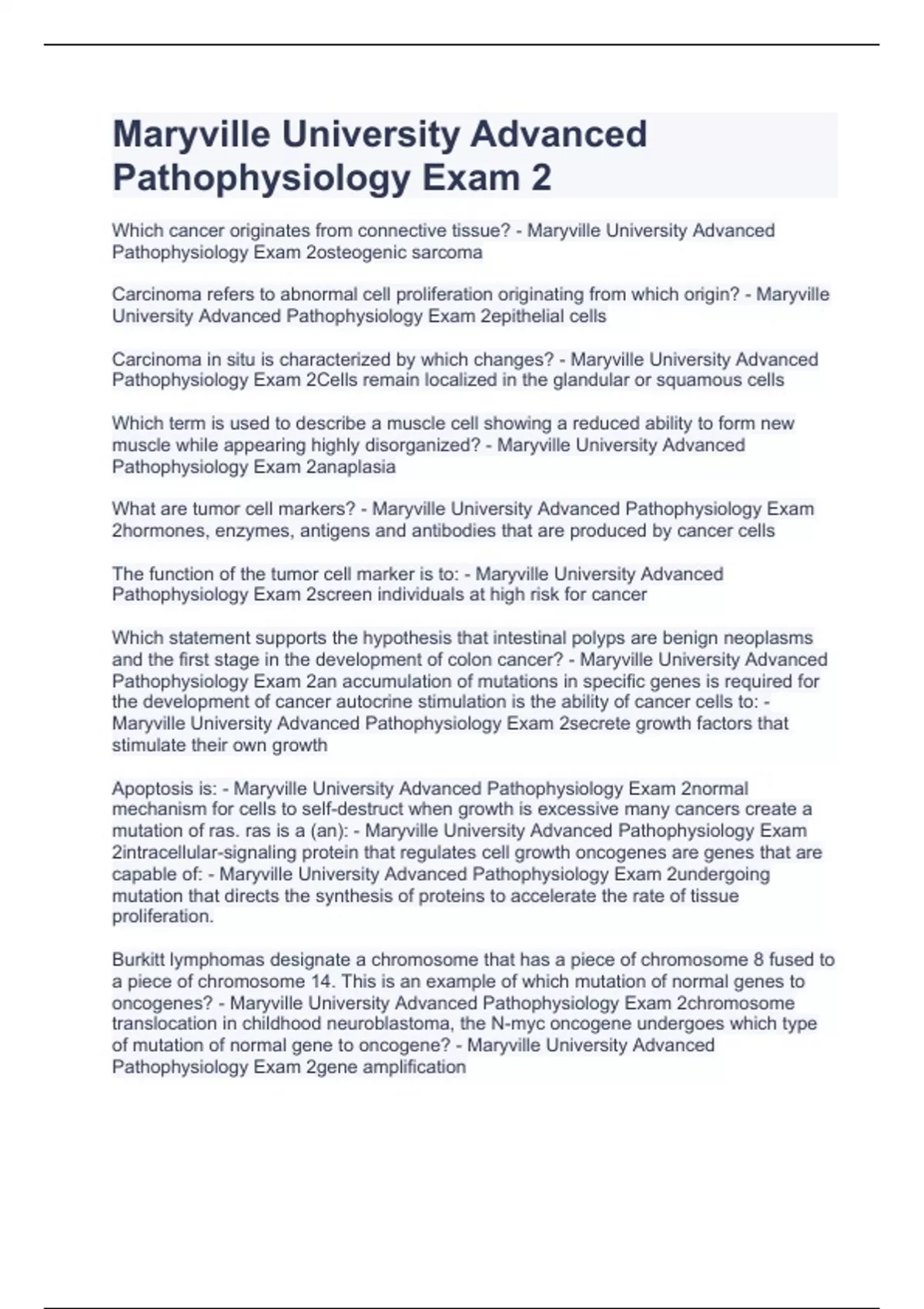 Maryville University Advanced Pathophysiology Exam 2 Which cancer originates from connective tissue? - Maryville University Advanced Pathophysiology Exam 2osteogenic sarcoma Carcinoma refers to abnormal cell proliferation originating from which origin? - Maryville University Advanced Pathophysiology Exam 2epithelial cells Carcinoma in situ is characterized by which changes? - Maryville University Advanced Pathophysiology Exam 2Cells remain localized in the glandular or squamous cells Which term is used to describe a muscle cell showing a reduced ability to form new muscle while appearing highly disorganized? - Maryville University Advanced Pathophysiology Exam 2anaplasia What are tumor cell markers? - Maryville University Advanced Pathophysiology Exam 2hormones, enzymes, antigens and antibodies that are produced by cancer cells The function of the tumor cell marker is to: - Maryville University Advanced Pathophysiology Exam 2screen individuals at high risk for cancer Which statement supports the hypothesis that intestinal polyps are benign neoplasms and the first stage in the development of colon cancer? - Maryville University Advanced Pathophysiology Exam 2an accumulation of mutations in specific genes is required for the development of cancer autocrine stimulation is the ability of cancer cells to: - Maryville University Advanced Pathophysiology Exam 2secrete growth factors that stimulate their own growth Apoptosis is: - Maryville University Advanced Pathophysiology Exam 2normal mechanism for cells to self-destruct when growth is excessive many cancers create a mutation of ras. ras is a (an): - Maryville University Advanced Pathophysiology Exam 2intracellular-signaling protein that regulates cell growth oncogenes are genes that are capable of: - Maryville University Advanced Pathophysiology Exam 2undergoing mutation that directs the synthesis of proteins to accelerate the rate of tissue proliferation. Burkitt lymphomas designate a chromosome that has a piece of chromosome 8 fused to a piece of chromosome 14. This is an example of which mutation of normal genes to oncogenes? - Maryville University Advanced Pathophysiology Exam 2chromosome translocation in childhood neuroblastoma, the N-myc oncogene undergoes which type of mutation of normal gene to oncogene? - Maryville University Advanced Pathophysiology Exam 2gene amplification What aberrant change causes the abnormal growth in retinoblastoma? - Maryville University Advanced Pathophysiology Exam 2the tumor suppressor gene is turned off Two "hits" are required to inactivate tumor-suppressor genes because: - Maryville University Advanced Pathophysiology Exam 2each allele must be altered, and each person has two copies, or alleles of each gene: one from each parent the ras gene converts from a proto-oncogene to an oncogene by: - Maryville University Advanced Pathophysiology Exam 2altering one or more nucleotide base pairs how do cancer cells use the enzyme telomerase? - Maryville University Advanced Pathophysiology Exam 2to switch on the telomerase to enable cells to divide indefinitely What are characteristics of a benign tumor? - Maryville University Advanced Pathophysiology Exam 2they include the suffix -oma Which terms represent the correct nomenclature for benign and malignant tumors of adipose tissue, respectively? - Maryville University Advanced Pathophysiology Exam 2lipoma, liposarcoma What is the major virus involved in the development of cervical cancer? - Maryville University Advanced Pathophysiology Exam 2HPV The papanicolaou (pap) test is used to screen for: - Maryville University Advanced Pathophysiology Exam 2cervical cancer What is the skin-related health risk induced by some forms of chemotherapy? - Maryville University Advanced Pathophysiology Exam 2infection Which cancers are all associated with chronic inflammation? - Maryville University Advanced Pathophysiology Exam 2colon, thyroid, urinary bladder chronic inflammation causes cancer by: - Maryville University Advanced Pathophysiology Exam 2releasing compounds such as ROS that promote mutations inherited mutations that predispose to cancer are almost invariably what kind of gene? - Maryville University Advanced Pathophysiology Exam 2tumor-suppressor genes What is the consequence for cells when the functioning TP53 gene is lost as a result of mutation? - Maryville University Advanced Pathophysiology Exam 2cells escape apoptosis Which GI tract condition can be an outcome of both chemotherapy and radiation? - Maryville University Advanced Pathophysiology Exam 2stomatitis What is the role of vascular endothelial growth factor and basic fibroblast growth factor in cell metastasis? - Maryville University Advanced Pathophysiology Exam 2to develop new blood vessels to feed cancer cells it has been determined that a tumor is in stage 2. What is the meaning of this finding? - Maryville University Advanced Pathophysiology Exam 2cancer is locally invasive