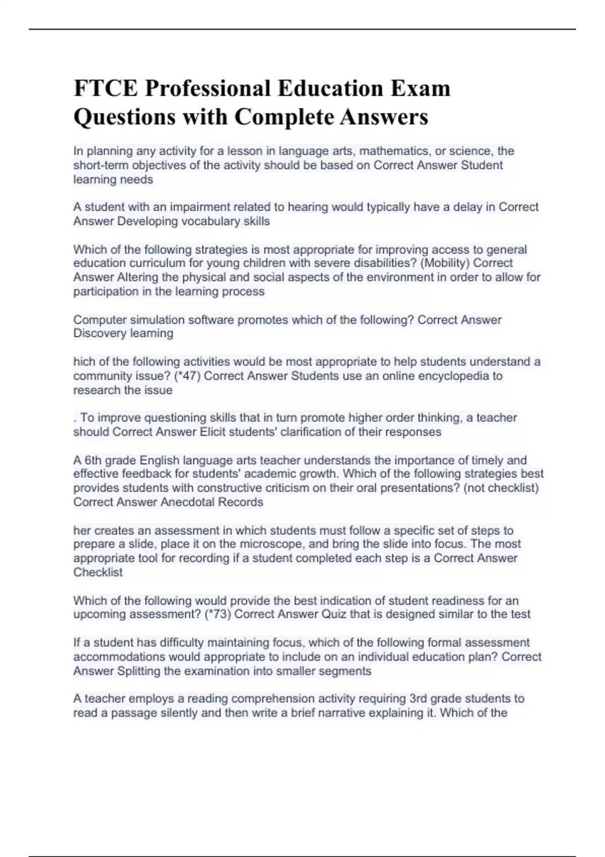 In planning any activity for a lesson in language arts, mathematics, or science, the short-term objectives of the activity should be based on Correct Answer Student learning needs A student with an impairment related to hearing would typically have a delay in Correct Answer Developing vocabulary skills Which of the following strategies is most appropriate for improving access to general education curriculum for young children with severe disabilities? (Mobility) Correct Answer Altering the physical and social aspects of the environment in order to allow for participation in the learning process Computer simulation software promotes which of the following? Correct Answer Discovery learning hich of the following activities would be most appropriate to help students understand a community issue? (*47) Correct Answer Students use an online encyclopedia to research the issue . To improve questioning skills that in turn promote higher order thinking, a teacher should Correct Answer Elicit students' clarification of their responses A 6th grade English language arts teacher understands the importance of timely and effective feedback for students' academic growth. Which of the following strategies best provides students with constructive criticism on their oral presentations? (not checklist) Correct Answer Anecdotal Records her creates an assessment in which students must follow a specific set of steps to prepare a slide, place it on the microscope, and bring the slide into focus. The most appropriate tool for recording if a student completed each step is a Correct Answer Checklist Which of the following would provide the best indication of student readiness for an upcoming assessment? (*73) Correct Answer Quiz that is designed similar to the test If a student has difficulty maintaining focus, which of the following formal assessment accommodations would appropriate to include on an individual education plan? Correct Answer Splitting the examination into smaller segments A teacher employs a reading comprehension activity requiring 3rd grade students to read a passage silently and then write a brief narrative explaining it. Which of the