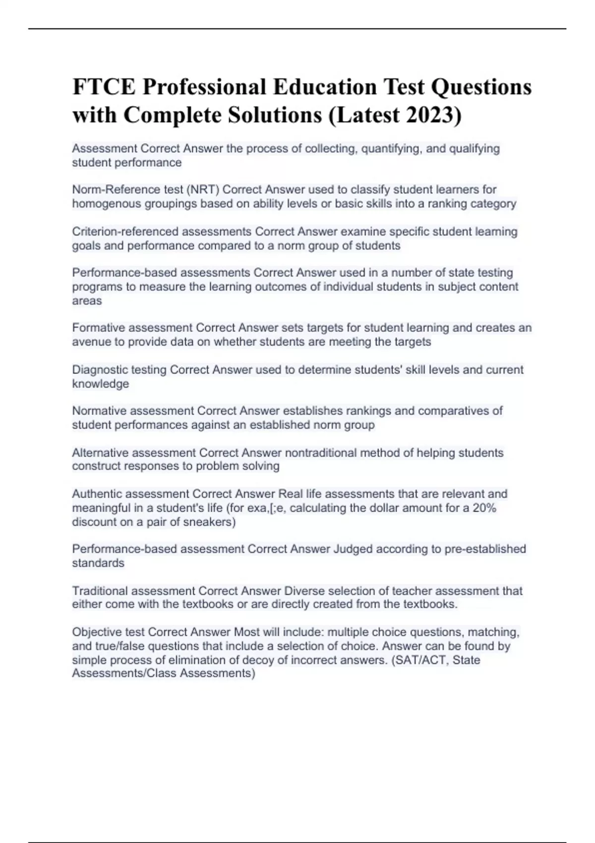 Assessment Correct Answer the process of collecting, quantifying, and qualifying student performance Norm-Reference test (NRT) Correct Answer used to classify student learners for homogenous groupings based on ability levels or basic skills into a ranking category Criterion-referenced assessments Correct Answer examine specific student learning goals and performance compared to a norm group of students Performance-based assessments Correct Answer used in a number of state testing programs to measure the learning outcomes of individual students in subject content areas Formative assessment Correct Answer sets targets for student learning and creates an avenue to provide data on whether students are meeting the targets Diagnostic testing Correct Answer used to determine students' skill levels and current knowledge Normative assessment Correct Answer establishes rankings and comparatives of student performances against an established norm group Alternative assessment Correct Answer nontraditional method of helping students construct responses to problem solving Authentic assessment Correct Answer Real life assessments that are relevant and meaningful in a student's life (for exa,[;e, calculating the dollar amount for a 20% discount on a pair of sneakers) Performance-based assessment Correct Answer Judged according to pre-established standards Traditional assessment Correct Answer Diverse selection of teacher assessment that either come with the textbooks or are directly created from the textbooks. Objective test Correct Answer Most will include: multiple choice questions, matching, and true/false questions that include a selection of choice. Answer can be found by simple process of elimination of decoy of incorrect answers. (SAT/ACT, State Assessments/Class Assessments)
