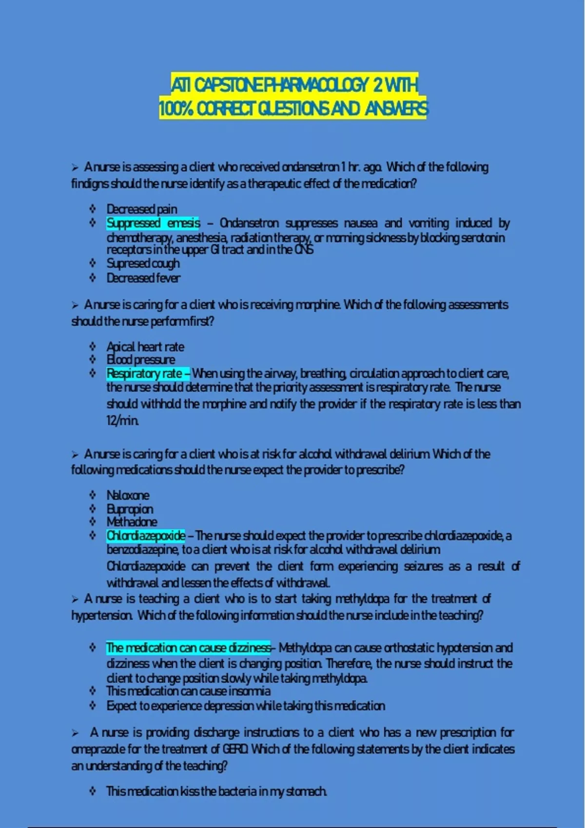 ATI CAPSTONE PHARMACOLOGY 2 WITH 100% CORRECT QUESTIONS AND ANSWERS  A nurse is assessing a client who received ondansetron 1 hr. ago. Which of the following findigns should the nurseidentify as a therapeutic effect of the medication?  Decreased pain  Suppressed emesis – Ondansetron suppresses nausea and vomiting induced by chemotherapy, anesthesia, radiation therapy,or morning sickness by blocking serotonin receptors in the upper GI tract and in the CNS  Supresed cough  Decreased fever  A nurse is caring for a client who is receiving morphine. Which of the following assessments should the nurse perform first?  Apical heart rate  Blood pressure  Respiratoryrate – When using the airway, breathing, circulation approach to client care, the nurseshould determine that the priority assessment isrespiratoryrate. The nurse should withhold the morphine and notify the provider if the respiratory rate is less than 12/min.  A nurse is caring for a client who is at risk for alcohol withdrawal delirium. Which of the following medications should the nurseexpect the provider to prescribe?  Naloxone  Bupropion  Methadone  Chlordiazepoxide – The nurseshould expect the provider to prescribechlordiazepoxide, a benzodiazepine, to a client who is at risk for alcohol withdrawal delirium. Chlordiazepoxide can prevent the client form experiencing seizures as a result of withdrawal and lessen the effects of withdrawal.  A nurse is teaching a client who is to start taking methyldopa for the treatment of hypertension. Which of thefollowing information should the nurseincludein theteaching?  The medication can cause dizziness- Methyldopa can cause orthostatic hypotension and dizziness when the client is changing position. Therefore, the nurse should instruct the client tochange position slowly while taking methyldopa.  This medication can causeinsomnia  Expect toexperience depression whiletaking this medication  A nurse is providing discharge instructions to a client who has a new prescription for omeprazole for the treatment of GERD. Which of the following statements by the client indicates an understanding of the teaching?  This medication kissthe bacteria in mystomach.  This medication neutralizes stomach acid  This medication coats thelining of my stomach.  This medication reduces stomach acid – GERD is a condition in which gastric acids refluxfrom thestomach totheesophagus. Omeprazoleis a proton inhibitor that suppresses the production of gastric acid. The medication reduces baseline acid levels and blocks production of nearly all stimulated acid production within 2 hrs. of an oral dose.  A nurse is caring for a client who reports using the herbal medication garlic along with prescribed warfarin. The nurse should identify that which of the following is a potential adverse effect of taking both of these products concurrently?  Altered renal perfusion  Elevated blood pressure  Increased ecchymosis- The nurse should identify that ecchymosis occurs when there is bleeding under the skin. Additionally, the nurseshould recognizethat, garlic has antiplatelets effects that can result in bleeding. When taken concurrently with an anticoagulant, such as warfarin, thereis an increased risk for bleeding