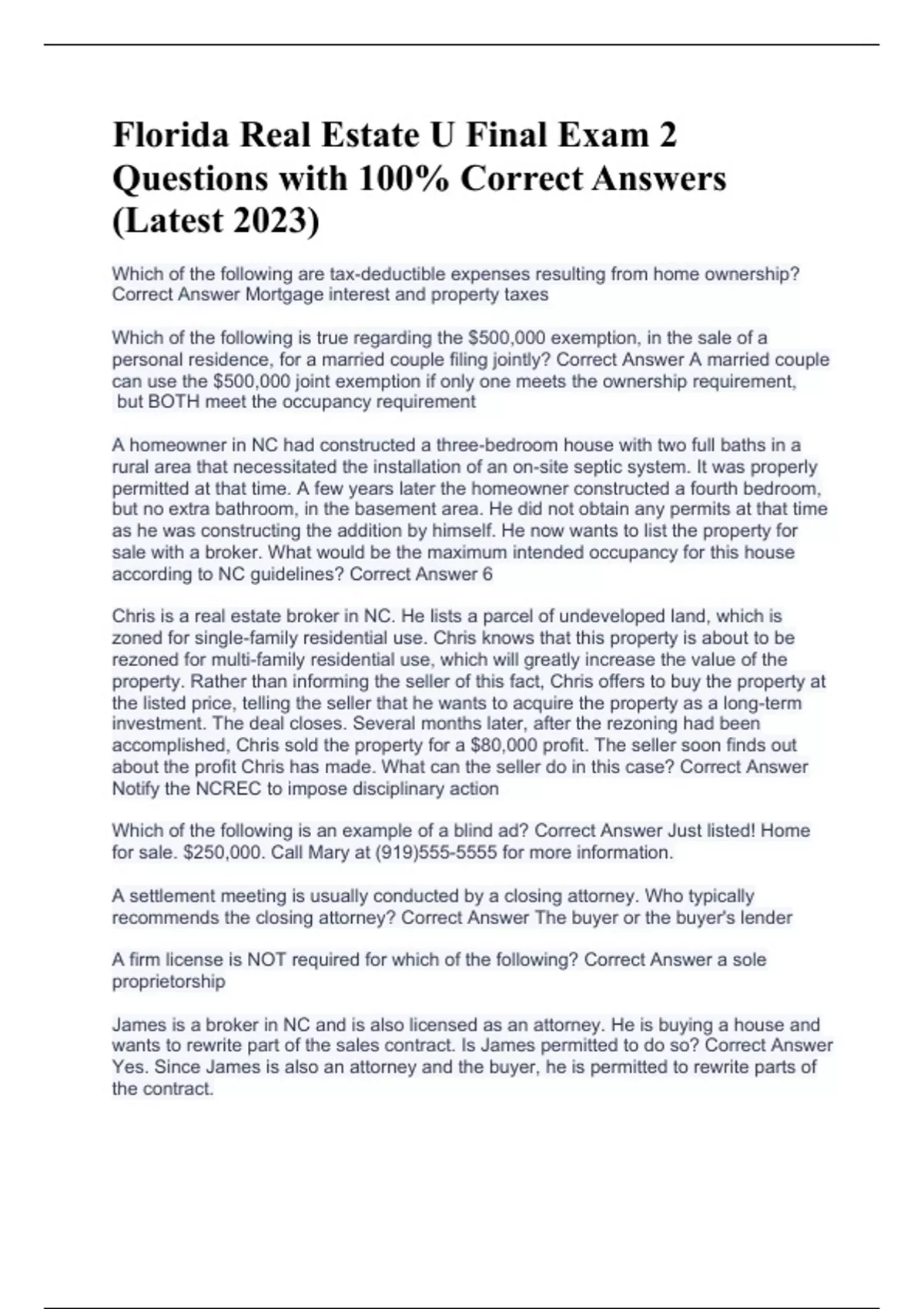 Florida Real Estate U Final Exam 2 Questions with 100% Correct Answers (Latest 2023)