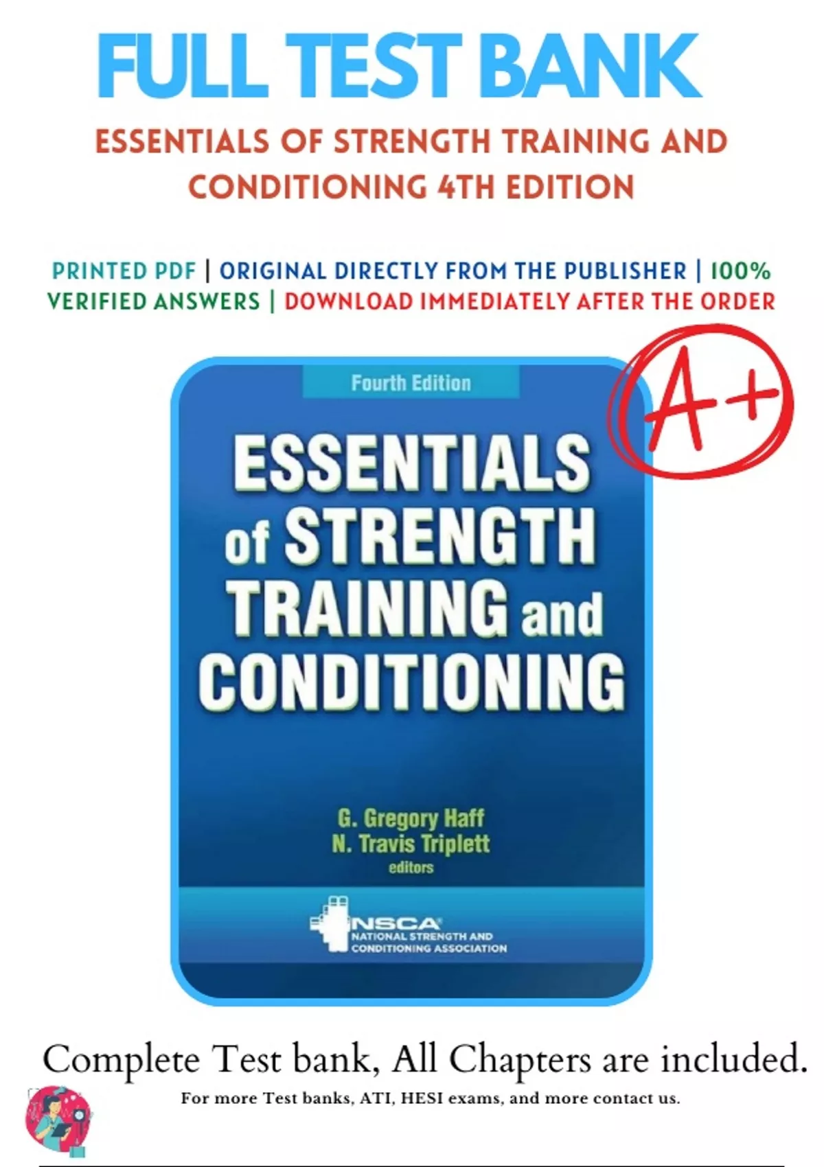 Boost your exam confidence with the Test Bank for Essentials of Strength Training and Conditioning 4th Edition by National Strength and Conditioning Association. Secure your printable PDF instantly, straight from the publisher, covering Chapters 1-24. Packed with in-depth questions and answers, it's a prime study resource for nursing students preparing to ace their tests!