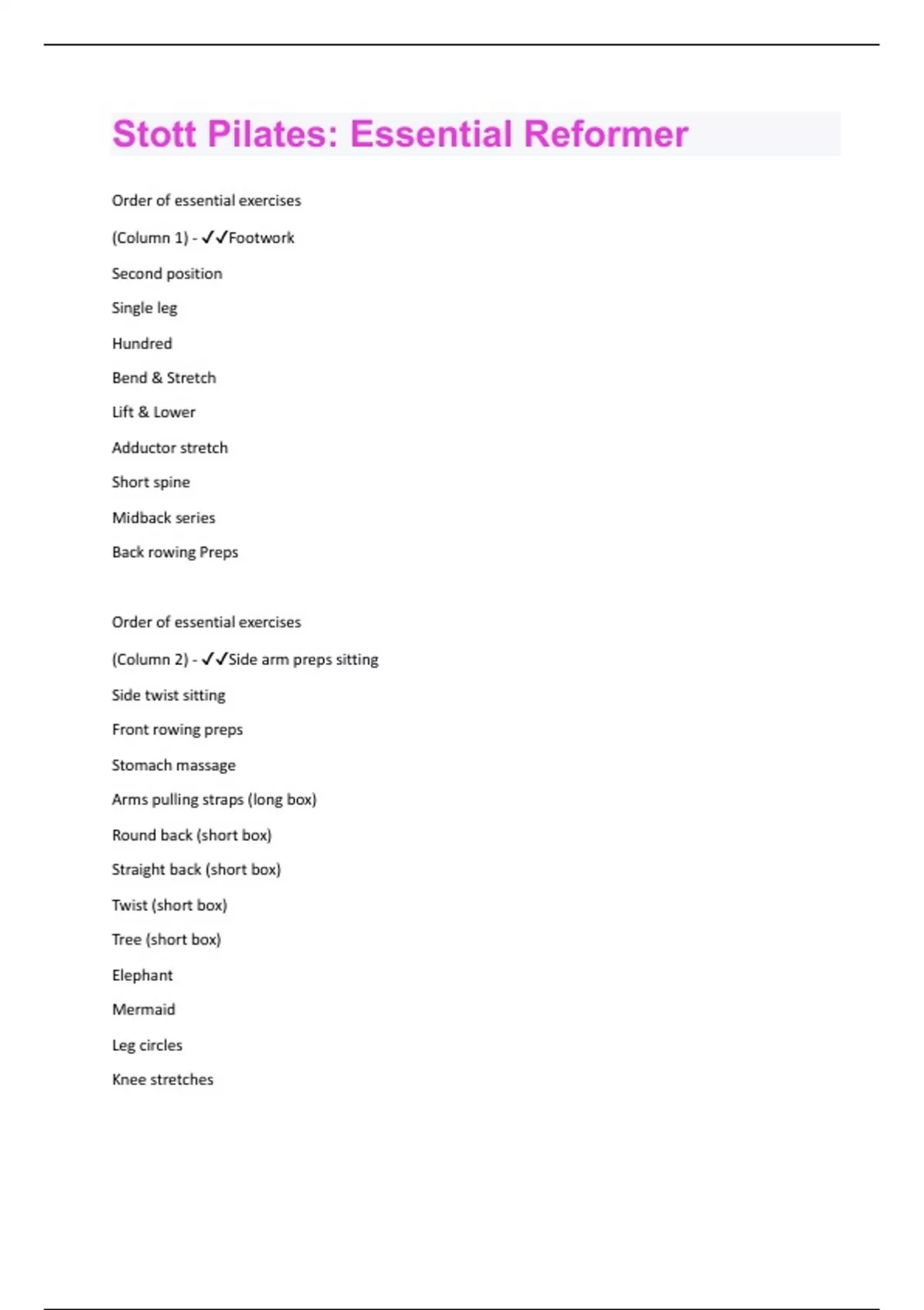Order of essential exercises (Column 1) - Footwork Second position Single leg Hundred Bend & Stretch Lift & Lower Adductor stretch Short spine Midback series Back rowing Preps Order of essential exercises (Column 2) - Side arm preps sitting Side twist sitting Front rowing preps Stomach massage Arms pulling straps (long box) Round back (short box) Straight back (short box) Twist (short box) Tree (short box) Elephant Mermaid Leg circles Knee stretchesRunning Hip lift Hip rolls Single thigh stretch Side splits Footwork 1-5 - 1. Toes apart heels together 2. Wrap toes on bar 3. Heels on bar 4. High half toe 5. Lower & Lift Second position 1-3 - 1. Parallel 2. Laterally rotated 3. Medially rotated Single leg 1-3 - 1. One leg bent 2. Bicycle 3. Single heel What is the spring tension for footwork? - 3-4 Springs