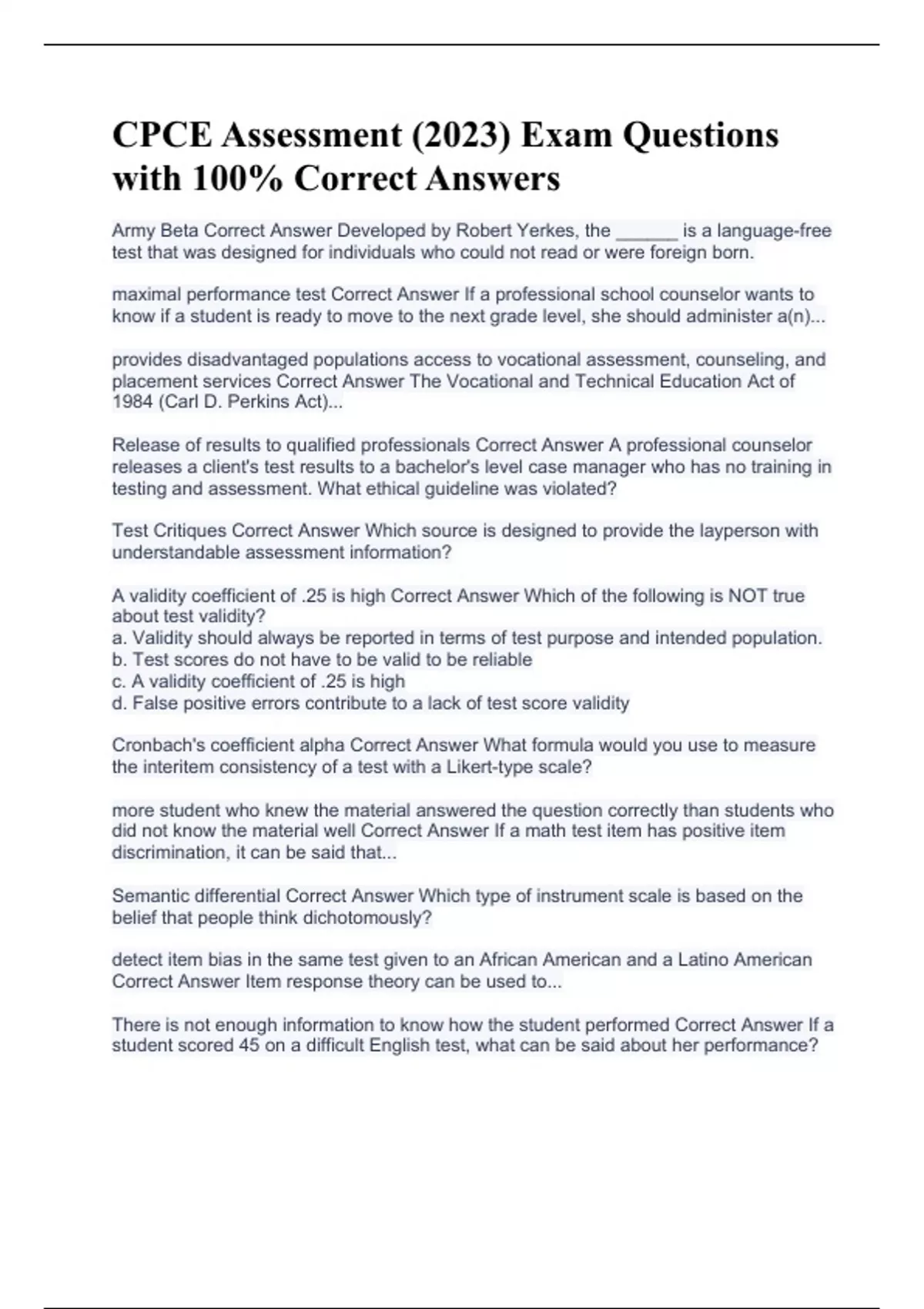 Army Beta Correct Answer Developed by Robert Yerkes, the ______ is a language-free test that was designed for individuals who could not read or were foreign born. maximal performance test Correct Answer If a professional school counselor wants to know if a student is ready to move to the next grade level, she should administer a(n)... provides disadvantaged populations access to vocational assessment, counseling, and placement services Correct Answer The Vocational and Technical Education Act of 1984 (Carl D. Perkins Act)... Release of results to qualified professionals Correct Answer A professional counselor releases a client's test results to a bachelor's level case manager who has no training in testing and assessment. What ethical guideline was violated? Test Critiques Correct Answer Which source is designed to provide the layperson with understandable assessment information? A validity coefficient of .25 is high Correct Answer Which of the following is NOT true about test validity? a. Validity should always be reported in terms of test purpose and intended population. b. Test scores do not have to be valid to be reliable c. A validity coefficient of .25 is high d. False positive errors contribute to a lack of test score validity Cronbach's coefficient alpha Correct Answer What formula would you use to measure the interitem consistency of a test with a Likert-type scale? more student who knew the material answered the question correctly than students who did not know the material well Correct Answer If a math test item has positive item discrimination, it can be said that... Semantic differential Correct Answer Which type of instrument scale is based on the belief that people think dichotomously? detect item bias in the same test given to an African American and a Latino American Correct Answer Item respons
