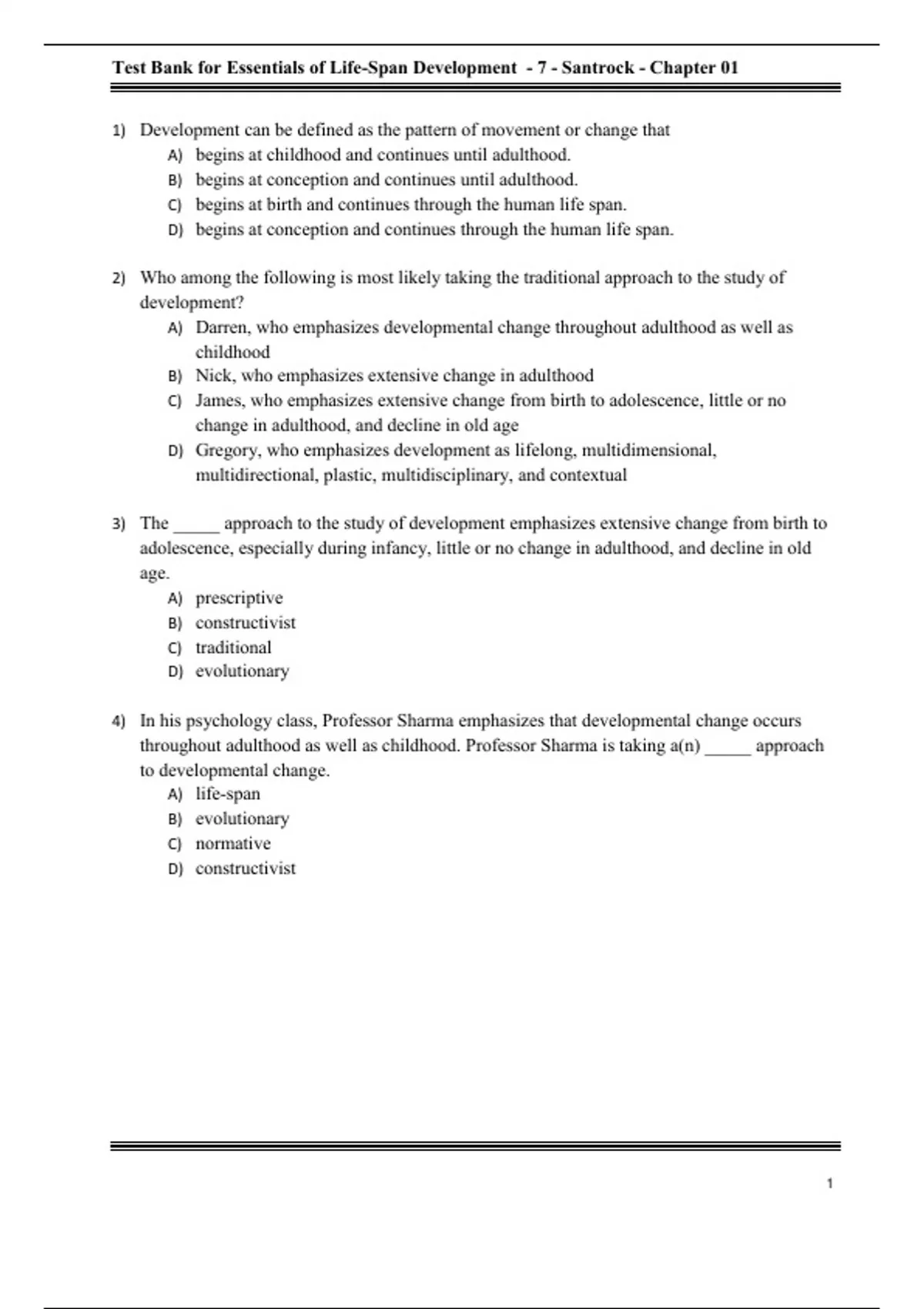 Test Bank for Essentials of Life -Span Development - 7 - Santrock - Chapter 01 1) Development can be defined as the pattern of movement or change that A) begins at childhood and continues until adulthood. B) begins at conception and continues until adulthood. C) begins at birth and continues through the human life span. D) begins at conception and continues through the human life span. 2) Who among the following is most likely taking the traditional approach to the study of development? A) Darren, who emphasizes developmental change throughout adulthood as well as childhood B) Nick, who emphasizes extensiv e change in adulthood C) James, who emphasizes extensive change from birth to adolescence, little or no change in adulthood, and decline in old age D) Gregory, who emphasizes development as lifelong, multidimensional, multidirectional, plastic, multidisciplinary , and contextual 3) The _____ approach to the study of development emphasizes extensive change from birth to adolescence, especially during infancy, little or no change in adulthood, and decline in old age. A) prescriptive B) constructivist C) traditional D) evolutionary 4) In his psychology class, Professor Sharma emphasizes that developmental change occurs throughout adulthood as well as childhood. Professor Sharma is taking a(n) _____ approach to developmental change. A) life-span B) evolutionary C) normative D) constructivist 1 Test Bank for Essentials of Life -Span Development - 7 - Santrock - Chapter 01 5) In the context of Laura Carstensen's view on life expectancy, which of the following statements is true? A) There has been a remarkable decrease in the number of people living to an old age. B) The conception of work as a full -time endeavor that ends in the early 60s is well suited for long lives. C) Science, technology, and behavioral changes have not kept pace with the increase in the number of people living to an old age. D) There should be a change from a world constructed mainly for the elderly to a world that is more compatible for young people. 6) On your first day of class, Professor Red -Elk claims that for too long we have focused on the development of young children, especially infants. She argues that the development of adults and elderly people is just as impor tant. This professor is articulating a(n) _____ approach. A) evolutionary B) constructivist C) normative D) life-span 7) The average life expectancy of humans A) has decreased over time. B) has increased over time. C) has remained steady since the middle ages. D) has remained stead y since the beginning of recorded history. 8) Which of the following is true of life expectancy in the United States? A) It decreased by 15 years in the beginning of the twenty -first century. B) It has remained unaffected by improvements in sanitation and nutritio n. C) It increased by 30 years in the twentieth century. D) It has remained unpredictable and has confused demographers. 9) Life expectancy in the United States is currently about A) 53 years. B) 60 years. C) 79 years. D) 85 years. 2 Test Bank for Essentials of Life -Span Development - 7 - Santrock - Chapter 01 10) According to Paul Baltes's perspective on life-span development, which of the following statements is true? A) Development stops during adolescence. B) Development is multidimensional. C) Development is unidirectional. D) Development occurs independent of context. 11) The idea that no age period dominates development highlights the life -span perspective that development is A) plastic. B) contextual. C) multidimensional. D) lifelong. 12) Dr. Tepper-Harmon believes that life -span development cannot be studied without considering biological, socioemotional, and cog nitive dimensions. Dr. Tepper -Harmon believes that development is A) lifelong. B) contextual. C) multidimensional. D) plastic. 13) Many individuals become wiser as they age, but their performance on tasks that require speed in processing information starts to decline. Th is illustrates how throughout life, some dimensions or components of a dimension expand and others shrink —in other words, how development is A) plastic. B) contextual. C) multidisciplinary. D) multidirectional. 14) Jeremy becomes fluent in English at the age of 4. At the age of 6, he becomes fluent in French. However, when Jeremy's parents try to teach him Spanish when he is 8 years old, they find that Jeremy's capacity to acquire a new language has decreased. This scenario most likely illustrates Paul Baltes's view that development is A) plastic. B) contextual. C) multidisciplinary. D) multidirectional. 3 Test Bank for Essentials of Life -Span Development - 7 - Santrock - Chapter 01 15) _____ means the capacity for change. A) Elasticity B) Plasticity C) Contextuality D) Tenacity 16) Bruce Chan, a 57-year-old accountant, decides to enroll in a short -term course on creative writing. He performs well in the course and is surprised that he does so despite not having engaged in creative writing for over 25 years. This scenario illustrates Paul Baltes's view that development is A) plastic. B) multidisciplinary. C) lifelong. D) contextual. 17) Divya is 65 years old. She undergoes training and uses effective strategies to improve her memory. As a result, her memory does not decline but rather improves as she ages. According to Paul Baltes's view, which of the following aspects of the life -span perspective most likely explains the improvement in Divya's memory? A) Development is plastic. B) Development is contextual. C) Development is multidirectional. D) Development is multidimensional. 18) It is anticipated that in 2050, roughly 32 percent of children in the United Stat es will have a Latino ethnic identity. What was the percentage of Latino children in the United States in 2017? A) 15.2 B) 20.2 C) 25.2 D) 30.2 19) According to Paul Baltes's life -span perspective, which of the following is true of contexts? A) They have a biological impact on development. B) They are influ