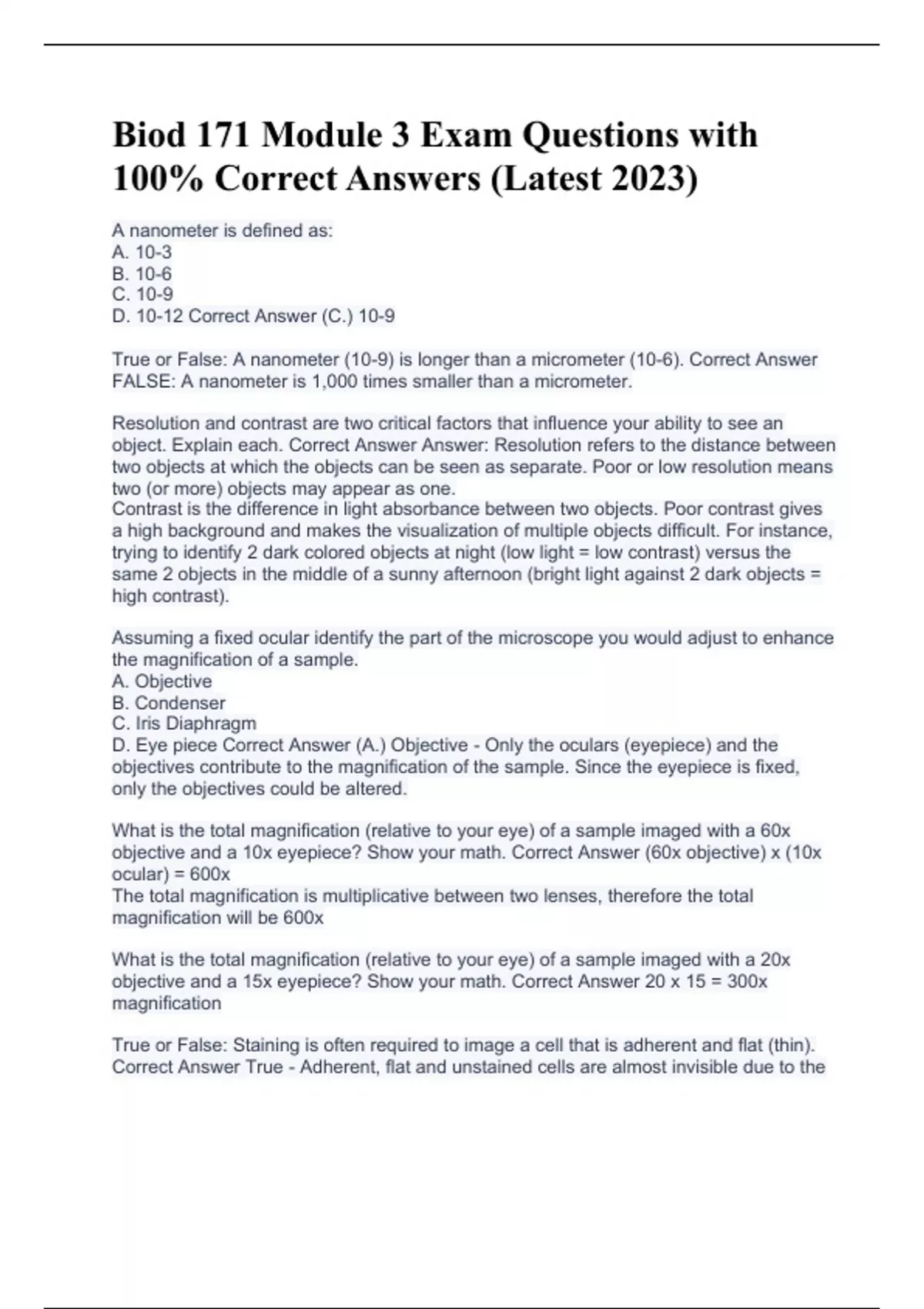 A nanometer is defined as: A. 10-3 B. 10-6 C. 10-9 D. 10-12 Correct Answer (C.) 10-9 True or False: A nanometer (10-9) is longer than a micrometer (10-6). Correct Answer FALSE: A nanometer is 1,000 times smaller than a micrometer. Resolution and contrast are two critical factors that influence your ability to see an object. Explain each. Correct Answer Answer: Resolution refers to the distance between two objects at which the objects can be seen as separate. Poor or low resolution means two (or more) objects may appear as one. Contrast is the difference in light absorbance between two objects. Poor contrast gives a high background and makes the visualization of multiple objects difficult. For instance, trying to identify 2 dark colored objects at night (low light = low contrast) versus the same 2 objects in the middle of a sunny afternoon (bright light against 2 dark objects = high contrast). Assuming a fixed ocular identify the part of the microscope you would adjust to enhance the magnification of a sample. A. Objective B. Condenser C. Iris Diaphragm D. Eye piece Correct Answer (A.) Objective - Only the oculars (eyepiece) and the objectives contribute to the magnification of the sample. Since the eyepiece is fixed, only the objectives could be altered. What is the total magnification (relative to your eye) of a sample imaged with a 60x objective and a 10x eyepiece? Show your math. Correct Answer (60x objective) x (10x ocular) = 600x The total magnification is multiplicative between two lenses, therefore the total magnification will be 600x What is the total magnification (relative to your eye) of a sample imaged with a 20x objective and a 15x eyepiece? Show your math. Correct Answer 20 x 15 = 300x magnification