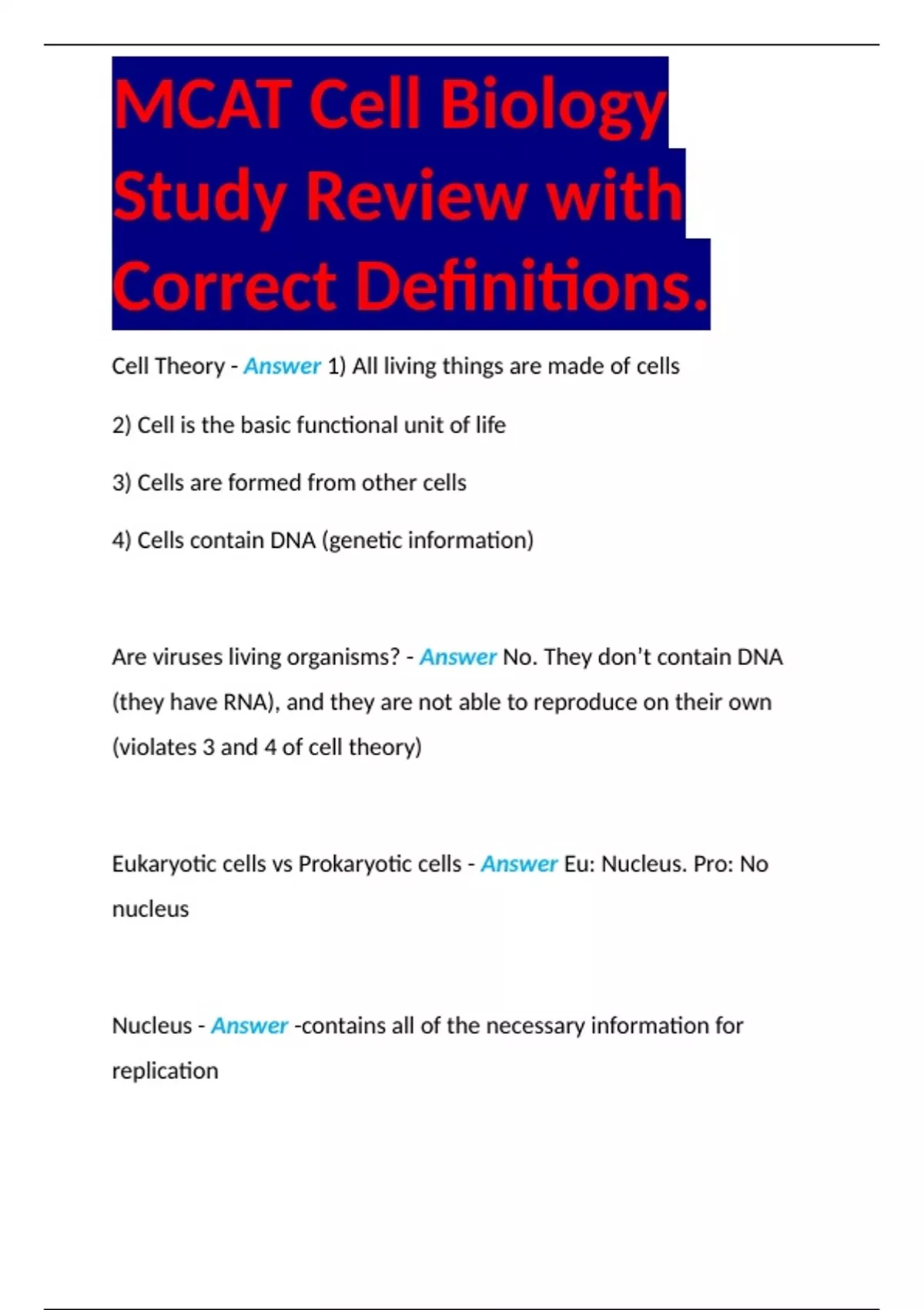 MCAT Cell Biology Study Review with Correct Definitions.