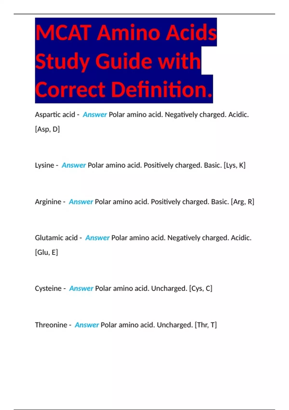 MCAT Amino Acids Study Guide with Correct Definition.