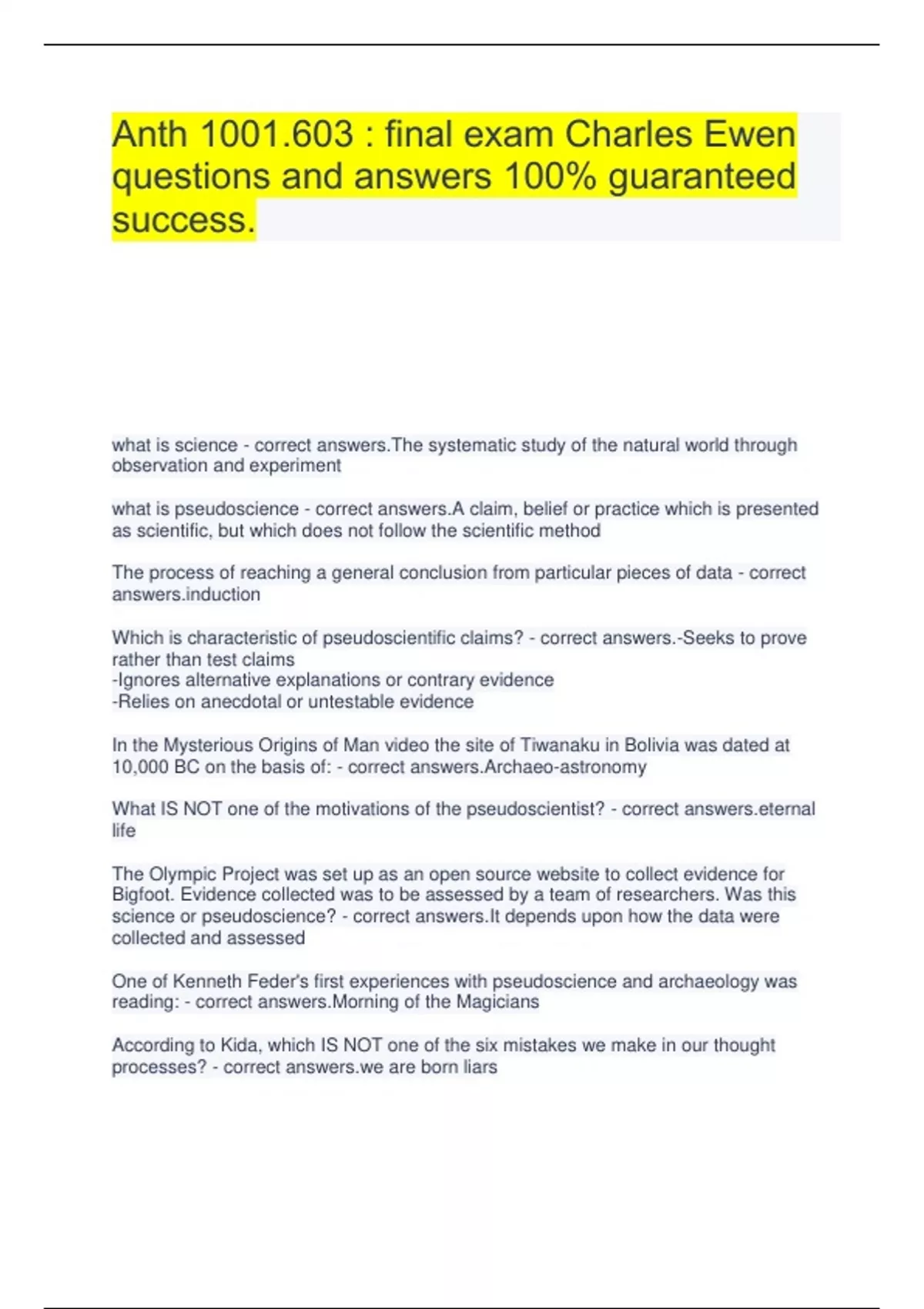 Anth 1001.603 : final exam Charles Ewen questions and answers 100% guaranteed success. what is science - correct answers.The systematic study of the natural world through observation and experiment what is pseudoscience - correct answers.A claim, belief or practice which is presented as scientific, but which does not follow the scientific method The process of reaching a general conclusion from particular pieces of data - correct tion Which is characteristic of pseudoscientific claims? - correct answers.-Seeks to prove rather than test claims -Ignores alternative explanations or contrary evidence -Relies on anecdotal or untestable evidence In the Mysterious Origins of Man video the site of Tiwanaku in Bolivia was dated at 10,000 BC on the basis of: - correct answers.Archaeo-astronomy What IS NOT one of the motivations of the pseudoscientist? - correct al life The Olympic Project was set up as an open source website to collect evidence for Bigfoot. Evidence collected was to be assessed by a team of researchers. Was this science or pseudoscience? - correct answers.It depends upon how the data were collected and assessed One of Kenneth Feder's first experiences with pseudoscience and archaeology was reading: - correct answers.Morning of the Magicians According to Kida, which IS NOT one of the six mistakes we make in our thought processes? - correct are born liars Jumping to the conclusion that mammoths still exist today, on the basis of a grainy video, is an example of how we - correct rceive our world In the Case of Childbed Fever in Feder's text, what was the outcome of Dr. Semmelweis's investigation of the mystery of the differing mortality rates? - correct answers.By testing different hypotheses he eventually arrived at the correct diagnosis What constitutes a red flag indicating possible pseudoscience at work? - correct answers.-The claim will "rewrite history" -The claimant wants to "prove" their hypothesis -The claimant implies that mainstream scientists are withholding information Conservative voters watching Fox News is an example of which Kida mistake in our thinking? - correct seek to confirm What is Occam's Razor? - correct answers.The answer requiring the fewest assumptions is probably the correct one How should one assess a fantastic claim? - correct answers.-Consider the source (is it a refereed publication?) -Ask if there are any corroborating sources -Consider the claimant and other "experts" credentials What is a Hoax? - correct answers.A deliberate deception masquerading as the truth What is epistemology? - correct answers.The study of knowledge (how we know what we know) Which is a motivation for a hoax? - correct answers.-Financial gain -Make a social statement -To embarrass someone Known as "God's hand", this hoaxer fooled the archaeological establishment in Japan with his planted finds that pushed back the earliest dates for that island's Paleolithic period - correct answers.Shinichi Fujimura The motivation(s) for the Cardiff Giant hoax was - correct answers.To make a statement about the fallacy of using the Bible as literal history According to Feder, what makes for a successful hoax? - correct answers.-Give the people what they want -Learn from your mistakes -Don't be too successful Are the Dare Stones genuine artifacts of the Lost Colony? - correct answers.The first one discovered is believed by some to be genuine, the others are admitted fakes