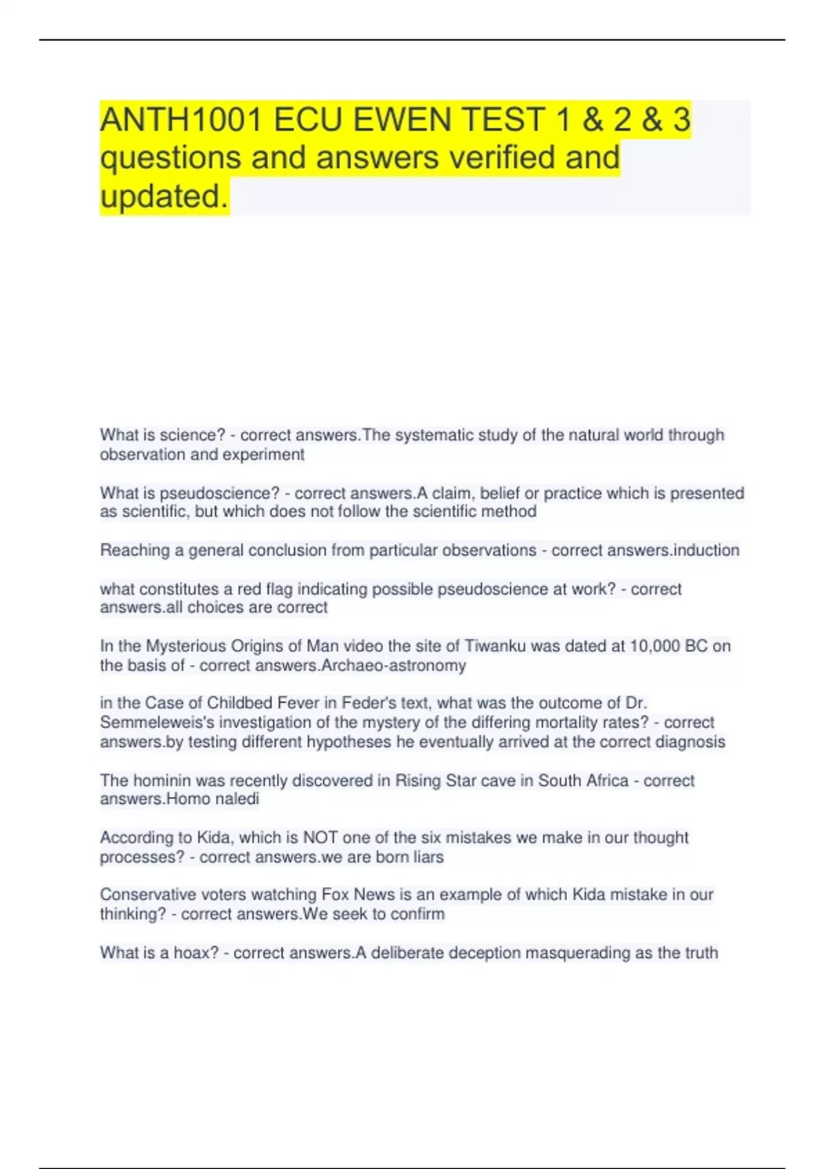ANTH1001 ECU EWEN TEST 1 & 2 & 3 questions and answers verified and updated. What is science? - correct answers.The systematic study of the natural world through observation and experiment What is pseudoscience? - correct answers.A claim, belief or practice which is presented as scientific, but which does not follow the scientific method Reaching a general conclusion from particular observations - correct tion what constitutes a red flag indicating possible pseudoscience at work? - correct choices are correct In the Mysterious Origins of Man video the site of Tiwanku was dated at 10,000 BC on the basis of - correct answers.Archaeo-astronomy in the Case of Childbed Fever in Feder's text, what was the outcome of Dr. Semmeleweis's investigation of the mystery of the differing mortality rates? - correct testing different hypotheses he eventually arrived at the correct diagnosis The hominin was recently discovered in Rising Star cave in South Africa - correct answers.Homo naledi According to Kida, which is NOT one of the six mistakes we make in our thought processes? - correct are born liars Conservative voters watching Fox News is an example of which Kida mistake in our thinking? - correct answers.We seek to confirm What is a hoax? - correct answers.A deliberate deception masquerading as the truth What is epistemology? - correct of knowledge What is Occam's Razor? - correct answers.The answer requiring the fewest assumptions is probably the correct one Which is a motivation for a hoax? - correct answers.All of the choices are correct. Known as "God's hand", this hoaxer fooled the archaeological establishment in Japan with his planted finds that pushed back the earliest dates for that island's Paleolithic period - correct miyazaki The original motivation for the Cardiff Giant hoax was - correct make a statement about the fallacy of using the Bible as literal history The evidence presented for the fossilized finger from Glen Rose, Texas dating to Cretaceous Era (110 million years ago) is an example of - correct answers.A pseudo-scientific presentation of the data Characteristics of thinking like a scientist include - correct sure a claim can be tested and consider alternative explanations what is not a concept of Darwin's Theory of Evolution - correct answers.Survival of the strongest According to Feder, what makes for a successful hoax? - correct answers.Learn from your mistakes Why are events happening by chance and coincidence so hard for people to accept? - correct choices are correct Extraordinary claims require extraordinary evidence is said by what type of person - correct answers.a skeptic the synthetic theory of evolution is - correct answers.Combining Darwins evolutionary ideas with Mendels genetics The Piltdown hoax - correct the deliberate fabrication of a fossil involving an ancient human cranium and a modern ape jaw Who IS NOT a suspect in the Piltdown hoax - correct answers.Harry Houdini the Piltdown fossil was originally classified as - correct answers.Eoanthropus dawsoni What is NOT on of the motivations of the pseud scientist? - correct al life Who had an influence on Darwins Theory of Evolution - correct choices are correct perception is - correct choices are correct According to Kida, what is not a factor that can affect our perceptions - correct answers.ESP The differential date between the jaw and cranium of Piltdown fossil was determined by - correct ine dating the Piltdown fossil was infected for so long bc - correct choices are correcft Which is an underlying principle of science? - correct answers.All of the choices are correct. The notion that scientific principles that operate in the present have operated the same in the past (i.e. they are immutable) is known as - correct rmitarianism which is a characteristic of pseudoscientific claims - correct choices are correct jumping to the conclusion that mammoths still exist today, on the basis of a grainy video, is an example of how we can - correct rceive our world How does one asses an extraordinary claim - correct choices are correct what is the scientific method - correct ve, induce a hypothesis, deduce test conditions, test your hypothesis what was the final verdict on the Alien Autopsy video? - correct was a demonstrated hoax The olympic project was set up as an open source website to collect evidence of Bigfoot. Evidence collect was to be assessed by a team of researchers. Was this science or pseudoscience? - correct depends upon how the data were collected and assessed How was the Japanese hoaxer, "God's hand", caught - correct answers.He was photographed "planting" artifacts by a local newspaper How was the Cardiff Giant hoax uncovered? - correct answers.George Hull confessed during Barnum's trial to unburden soul One of Kenneth Feders first experiences with pseudoscience and archaeology was reading - correct answers.Morning of the Magicians