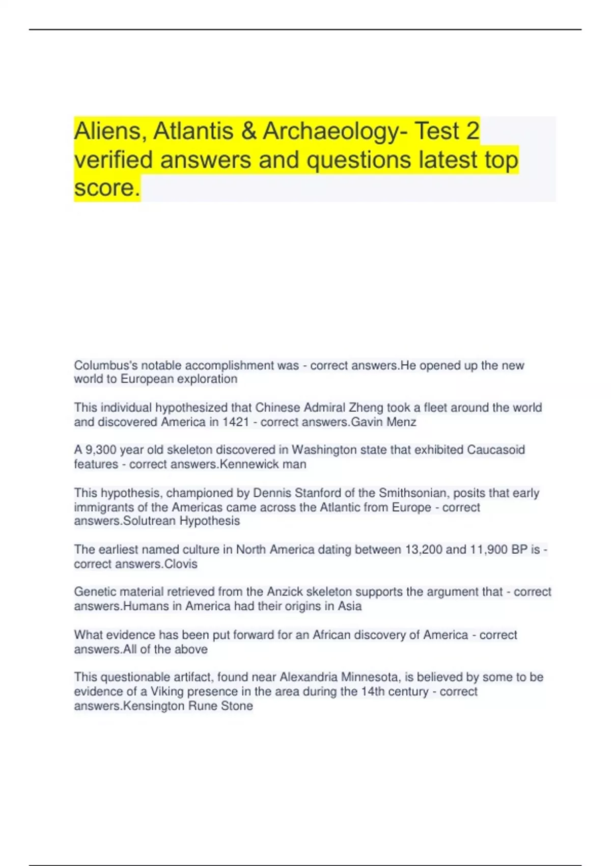 Aliens, Atlantis & Archaeology- Test 2 verified answers and questions latest top score. Columbus's notable accomplishment was - correct answers.He opened up the new world to European exploration This individual hypothesized that Chinese Admiral Zheng took a fleet around the world and discovered America in 1421 - correct answers.Gavin Menz A 9,300 year old skeleton discovered in Washington state that exhibited Caucasoid features - correct answers.Kennewick man This hypothesis, championed by Dennis Stanford of the Smithsonian, posits that early immigrants of the Americas came across the Atlantic from Europe - correct answers.Solutrean Hypothesis The earliest named culture in North America dating between 13,200 and 11,900 BP is - correct answers.Clovis Genetic material retrieved from the Anzick skeleton supports the argument that - correct answers.Humans in America had their origins in Asia What evidence has been put forward for an African discovery of America - correct answers.All of the above This questionable artifact, found near Alexandria Minnesota, is believed by some to be evidence of a Viking presence in the area during the 14th century - correct answers.Kensington Rune Stone This site in New Hampshire, which Harvard marine biologist Barry Fell attributed to bronze ago Iberian's, actually turns out to be 19th century farmstead - correct answers.Mystery Hill: America's stone age Genuine evidence of early Europe exploration in North America - correct answers.De Soto The idea of a lost race of Mound builders in North America was put forth during which period of archaeological thought? - correct answers.Speculative What evidence was put forth to show that American Indians could not have built the mounds? - correct answers.All answers are correct The Israelite's hypothesis states - correct answers.The mound-birds were descendants from one of the lost tribes of Israel These artifacts, purported to have been found in mounds in Ohio, hand writing on them that was deemed to be ancient Hebrew - correct answers.Newark Holy Stones When we act in a certain way, because we believe something to be true and our actions cause it to occur - correct answers.Self-fulfilling prophecy This artifact purposed to tell the story of how the ancient Lenape (Delaware) Indians came to the new world over the Bering Land Bridge from Asia - correct answers.Wallum Olum The conical burial mound in the Ohio River Valley containing exotic grave goods belongs to the _____ culture - correct answers.Adena/Hopewell This Mississippian site near St. Louis has the largest earthen mound in North America and a population tat may have exceeded 10,000 inhabitants - correct answers.Cahokia This fraudulent artifact from Tennessee was first thought to have Cherokee writing on it, but later, equally misinformed interpretation claimed it was ancient Hebrew - correct answers.Bat Creek Stone This mt-DNA lineage has been used to (unsuccessfully) tie Native Americans with new Eastern populations - correct answers.Haplogroup x A person using bent rods to locate buried resources if practicing - correct answers.Dowsing Frederick Bligh Bond's success in his investigation of Glastonbury Abbey can best be explained by - correct answers.His familiarity with medieval architecture