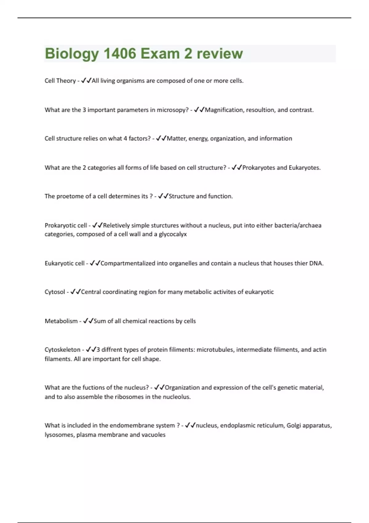 Cell Theory - All living organisms are composed of one or more cells. What are the 3 important parameters in microsopy? - Magnification, resoultion, and contrast. Cell structure relies on what 4 factors? - Matter, energy, organization, and information What are the 2 categories all forms of life based on cell structure? - Prokaryotes and Eukaryotes. The proetome of a cell determines its ? - Structure and function. Prokaryotic cell - Reletively simple sturctures without a nucleus, put into either bacteria/archaea categories, composed of a cell wall and a glycocalyx Eukaryotic cell - Compartmentalized into organelles and contain a nucleus that houses thier DNA. Cytosol - Central coordinating region for many metabolic activites of eukaryotic Metabolism - Sum of all chemical reactions by cells Cytoskeleton - 3 diffrent types of protein filiments: microtubules, intermediate filiments, and actin filaments. All are important for cell shape. What are the fuctions of the nucleus? - Organization and expression of the cell's genetic material, and to also assemble the ribosomes in the nucleolus. What is included in the endomembrane system ? - nucleus, endoplasmic reticulum, Golgi apparatus, lysosomes, plasma membrane and vacuolesPalade's pulse-chase experiments demonstrated what? - That secreted proteins move sequentialy through the ER and Golgi apparatus