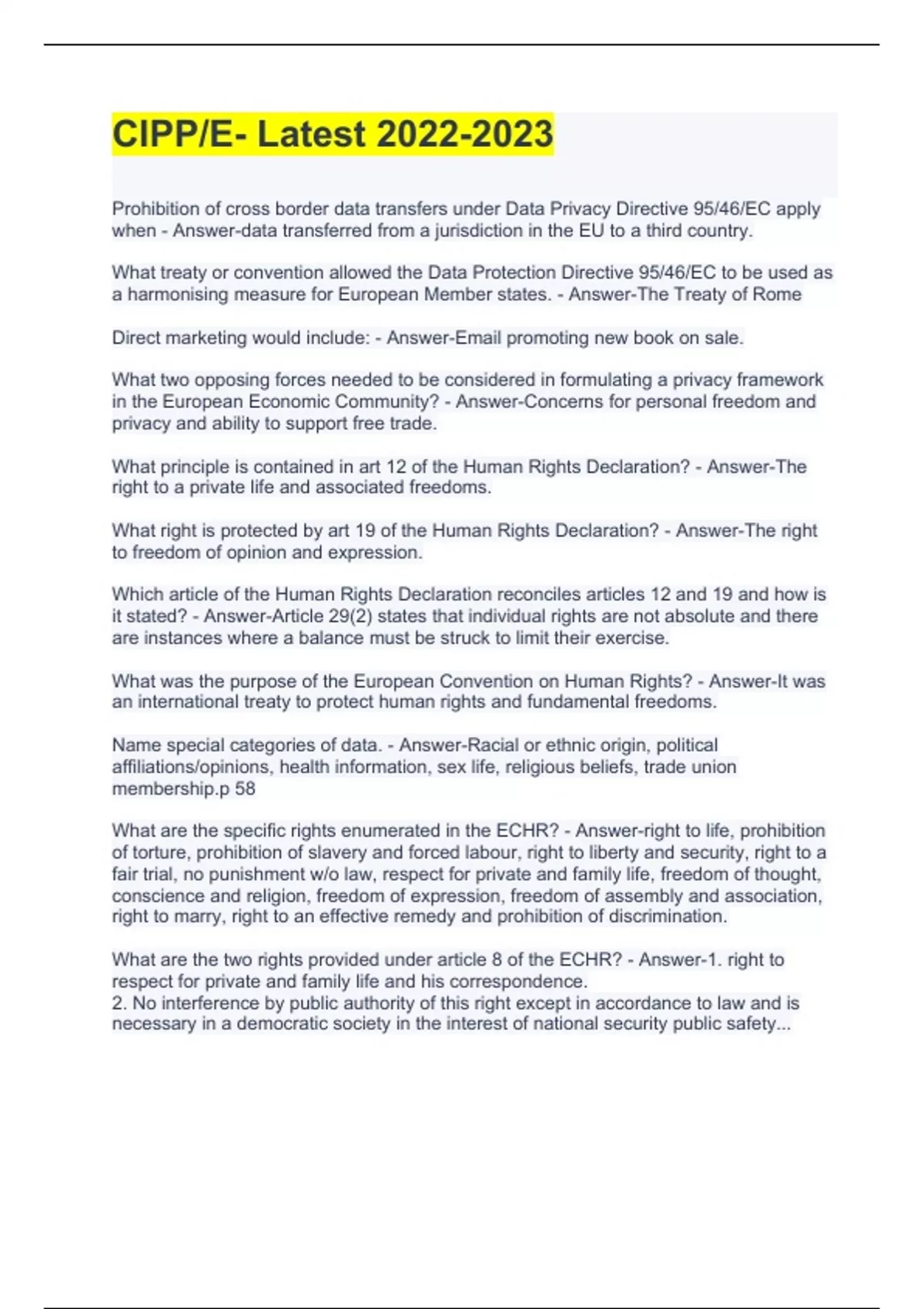 Prohibition of cross border data transfers under Data Privacy Directive 95/46/EC apply when - Answer-data transferred from a jurisdiction in the EU to a third country. What treaty or convention allowed the Data Protection Directive 95/46/EC to be used as a harmonising measure for European Member states. - Answer-The Treaty of Rome Direct marketing would include: - Answer-Email promoting new book on sale. What two opposing forces needed to be considered in formulating a privacy framework in the European Economic Community? - Answer-Concerns for personal freedom and privacy and ability to support free trade. What principle is contained in art 12 of the Human Rights Declaration? - Answer-The right to a private life and associated freedoms. What right is protected by art 19 of the Human Rights Declaration? - Answer-The right to freedom of opinion and expression. Which article of the Human Rights Declaration reconciles articles 12 and 19 and how is it stated? - Answer-Article 29(2) states that individual rights are not absolute and there are instances where a balance must be struck to limit their exercise. What was the purpose of the European Convention on Human Rights? - Answer-It was an international treaty to protect human rights and fundamental freedoms. Name special categories of data. - Answer-Racial or ethnic origin, political affiliations/opinions, health information, sex life, religious beliefs, trade union membership.p 58 What are the specific rights enumerated in the ECHR? - Answer-right to life, prohibition of torture, prohibition of slavery and forced labour, right to liberty and security, right to a fair trial, no punishment w/o law, respect for private and family life, freedom of thought, conscience and religion, freedom of expression, freedom of assembly and association, right to marry, right to an effective remedy and prohibition of discrimination. What are the two rights provided under article 8 of the ECHR? - Answer-1. right to respect for private and family life and his correspondence. 2. No interference by public authority of this right except in accordance to law and is necessary in a democratic society in the interest of national security public safety...