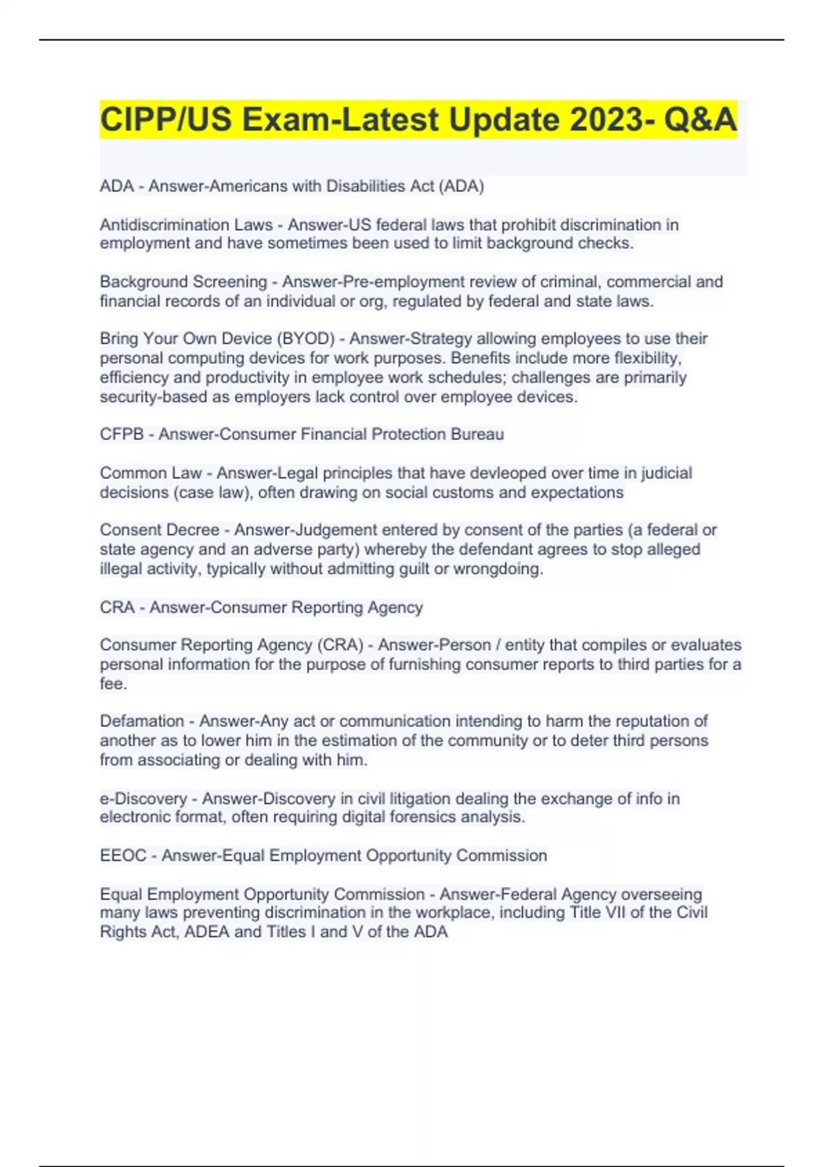 ADA - Answer-Americans with Disabilities Act (ADA) Antidiscrimination Laws - Answer-US federal laws that prohibit discrimination in employment and have sometimes been used to limit background checks. Background Screening - Answer-Pre-employment review of criminal, commercial and financial records of an individual or org, regulated by federal and state laws. Bring Your Own Device (BYOD) - Answer-Strategy allowing employees to use their personal computing devices for work purposes. Benefits include more flexibility, efficiency and productivity in employee work schedules; challenges are primarily security-based as employers lack control over employee devices. CFPB - Answer-Consumer Financial Protection Bureau Common Law - Answer-Legal principles that have devleoped over time in judicial decisions (case law), often drawing on social customs and expectations Consent Decree - Answer-Judgement entered by consent of the parties (a federal or state agency and an adverse party) whereby the defendant agrees to stop alleged illegal activity, typically without admitting guilt or wrongdoing. CRA - Answer-Consumer Reporting Agency Consumer Reporting Agency (CRA) - Answer-Person / entity that compiles or evaluates personal information for the purpose of furnishing consumer reports to third parties for a fee. Defamation - Answer-Any act or communication intending to harm the reputation of another as to lower him in the estimation of the community or to deter third persons from associating or dealing with him. e-Discovery - Answer-Discovery in civil litigation dealing the exchange of info in electronic format, often requiring digital forensics analysis. EEOC - Answer-Equal Employment Opportunity Commission Equal Employment Opportunity Commission - Answer-Federal Agency overseeing many laws preventing discrimination in the workplace, including Title VII of the Civil Rights Act, ADEA and Titles I and V of the ADA Evidentiary Privilege - Answer-Privileges limiting or prohibiting disclosure of personal information in the context of investigations and litigation, such as attorney-client privilege.