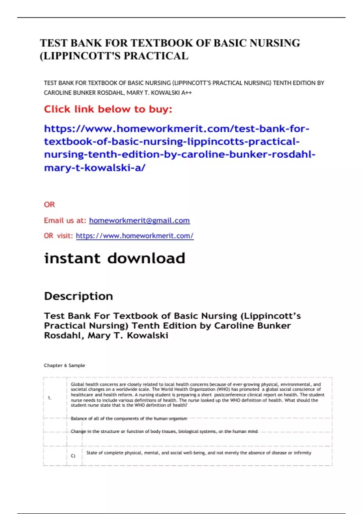 TEST BANK FOR TEXTBOOK OF BASIC NURSING (LIPPINCOTT'S PRACTICAL NURSING) TENTH EDITION BY CAROLINE B